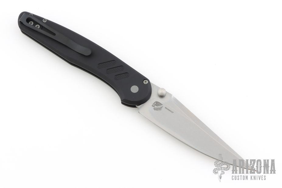 Peace Neighbor Designed Avalon featuring a knurled black aluminum handle paired with a stonewashed MagnaCut blade. Blasted thumb studs and matching hardware complement the design, while a black long deep-carry pocket clip keeps it secure and discreet. A sleek, modern EDC built for performance and daily carry.  New from maker!