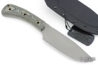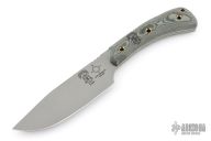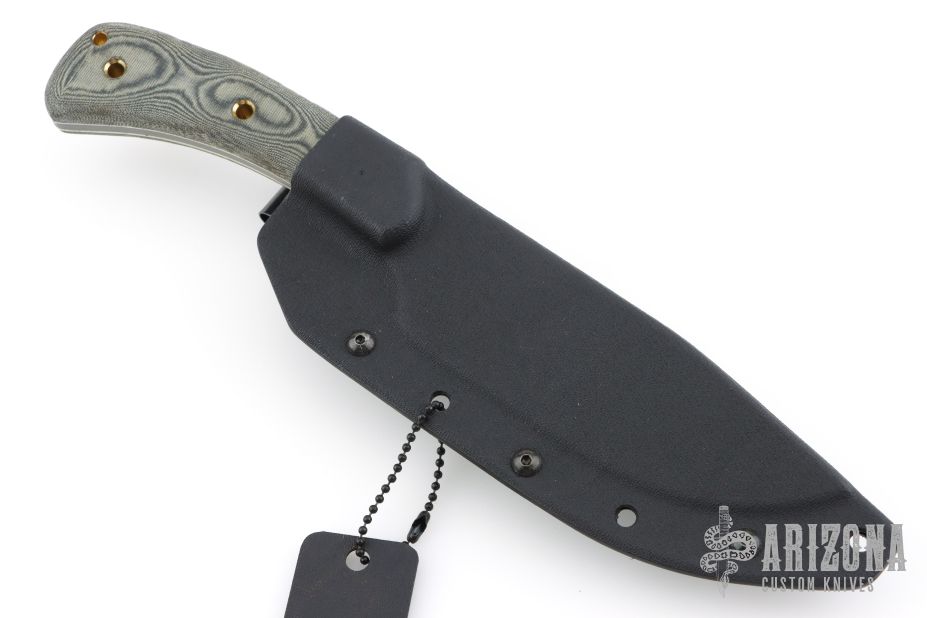 This knife by Tops features a grey coated clip point blade with notched thumbrest, .121" blade stock and 1.580" blade depth, full tang construction. The handle has black micarta scales with white liners and brass tube pins. Comes with original Kydex sheath. Excellent condition.