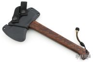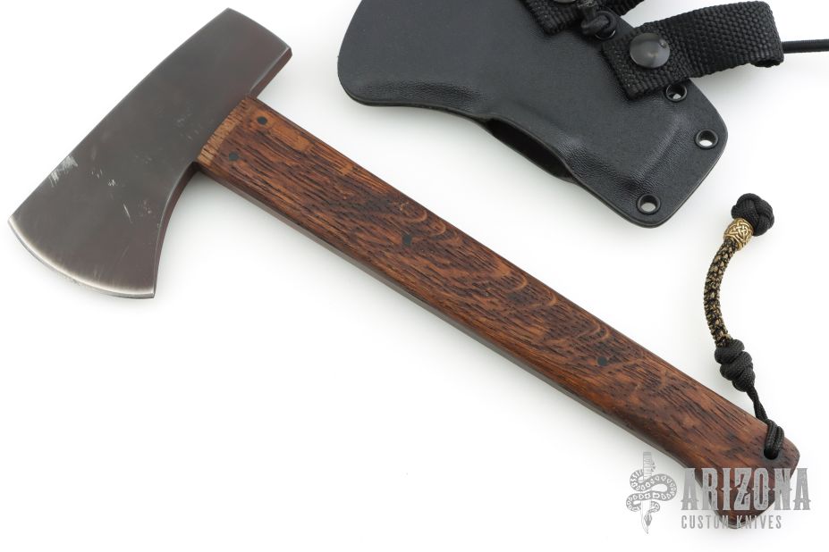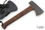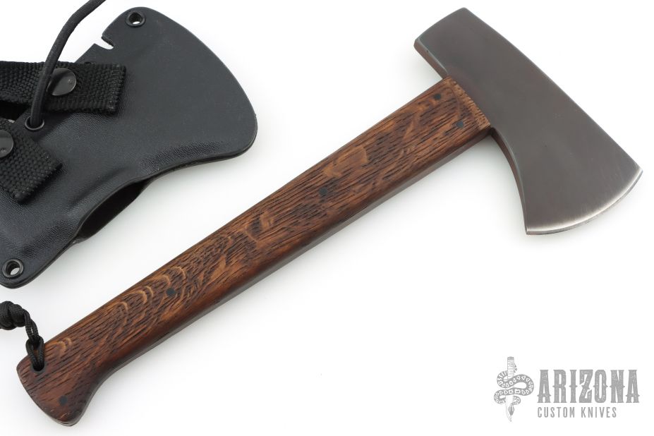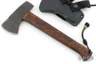 The Winkler Knives' Highland Hatchet features Quarter Sawn, Curly White Oak handles in a rich brown with a beeswax finish. The black oxide surface of the steel is feathered along the cutting edge, reminiscent of Daniel Winkler’s forged works.