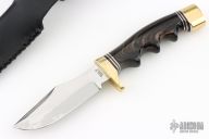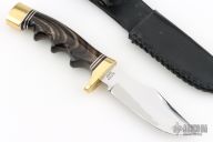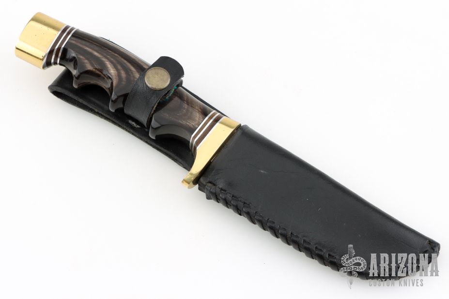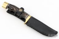 This knife by Ozekes Sinop features a mirror polished blade with false top edge, .147" blade stock and 1.164" blade depth, hidden tang construction. The handle has a brass guard and butt, buffalo horn grip with black and aluminum spacers. Comes with a black leather sheath. Comes with an original Ozekes Brothers catalog. Has some light scratches and patina, otherwise good condition.