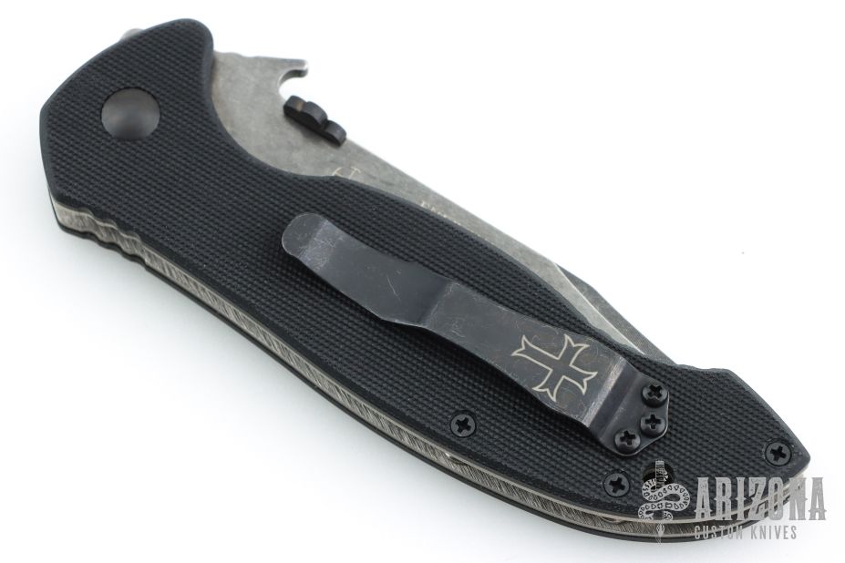 This Order of the Black Shamrock by Emerson knives features a black blade with notched thumbrest, thumbdisc and wave feature. The handle has black G-10 scales, titanium liners, satin standoffs backspacer and black tip up stainless steel clip. Comes with original box and papers. Excellent condition. #211