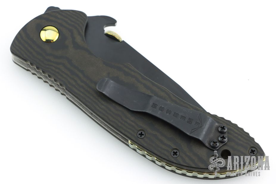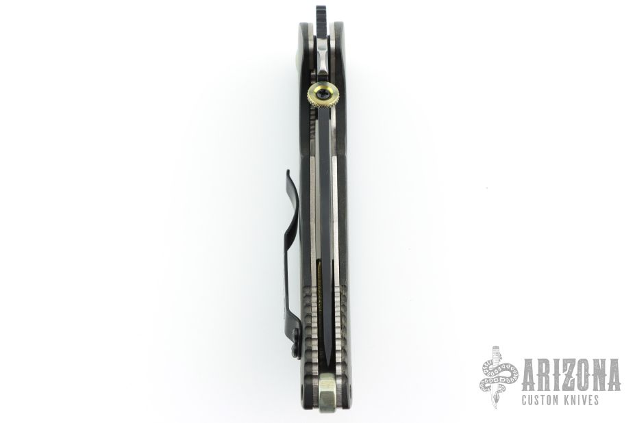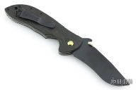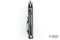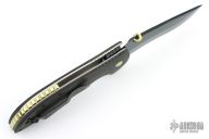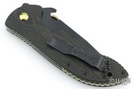 This Bling Mohawk Commander by Emerson features a black blade with notched thumbrest, anodized thumbdisc and Mohawk wave feature. The handle has richlite scales, titanium liners, black stainless steel tip up clip. S/N 0028. Notched anodized backstrap. Comes with original box and papers. Excellent condition.