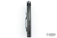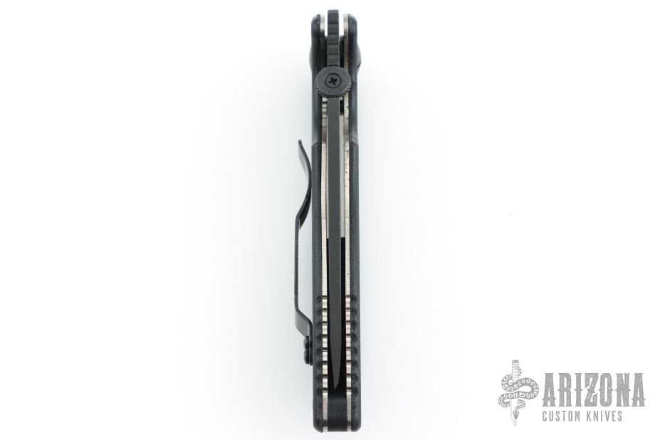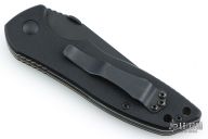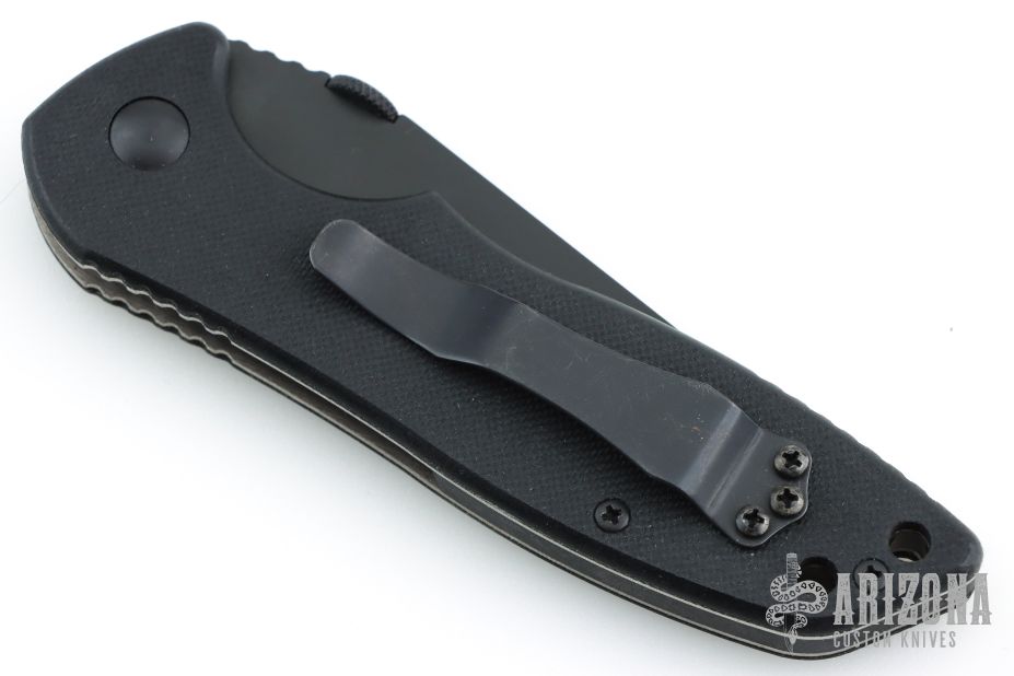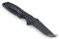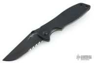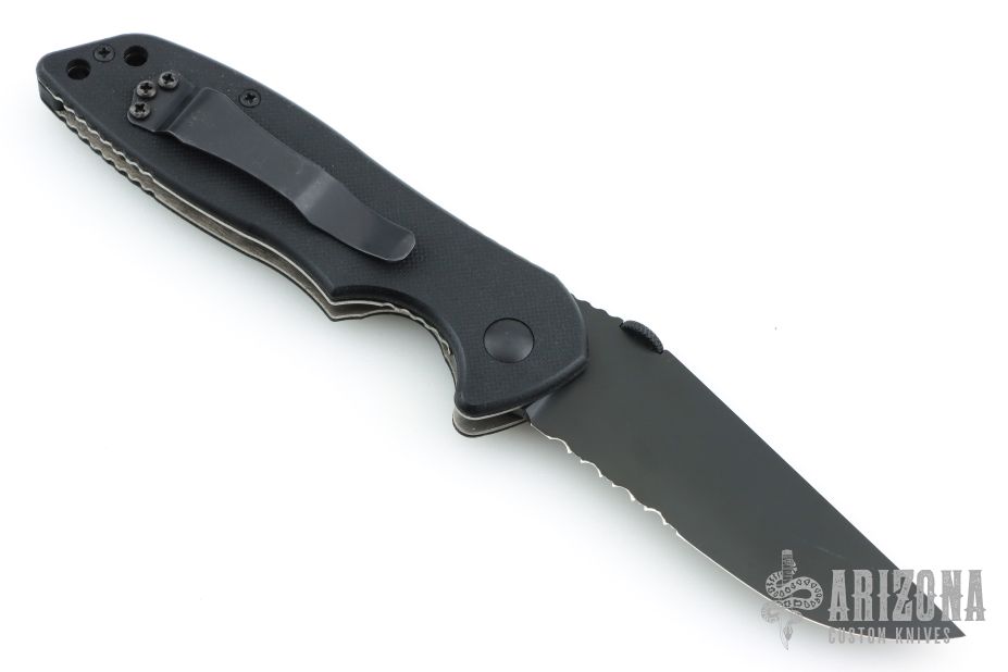 This Mach-1 by Emerson Knives features a black partially serrated blade with thumb disc and notched thumbrest. Textured black G-10 scales over titanium liners, black tip up stainless steel clip. Dated 2000. Comes in an Emerson box. Has a couple might scuffs, excellent condition.