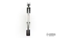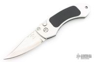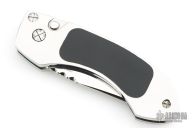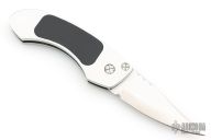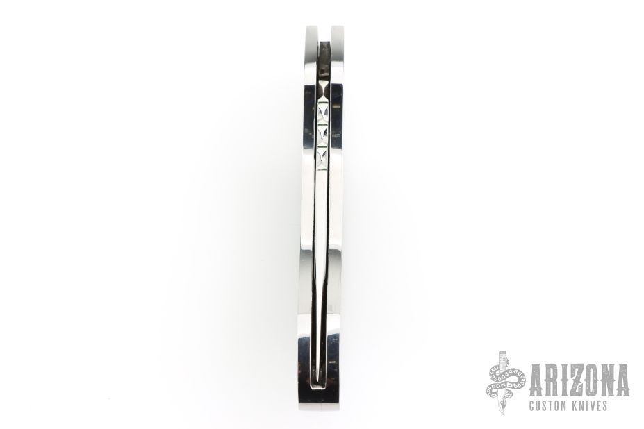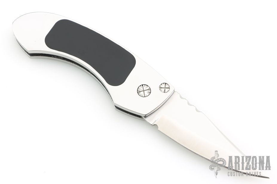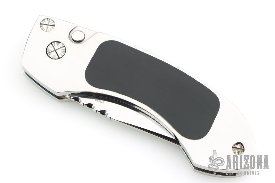 This Auto by Frank Potter features a satin/mirror polished blade with fileworked spine. The handle has a mirror finished stainless steel frame with black inlays. Has fileworked screws. Comes with a Velcro case. Nice action, lockup and blade seating. Has some very light scratches, otherwise excellent condition.