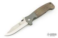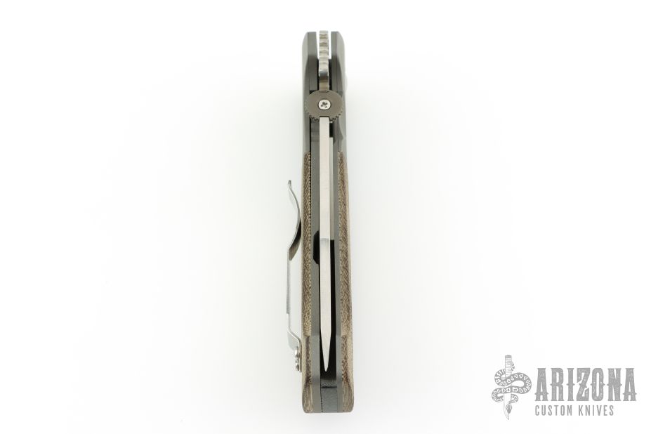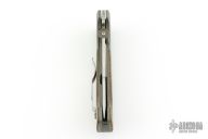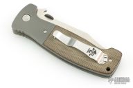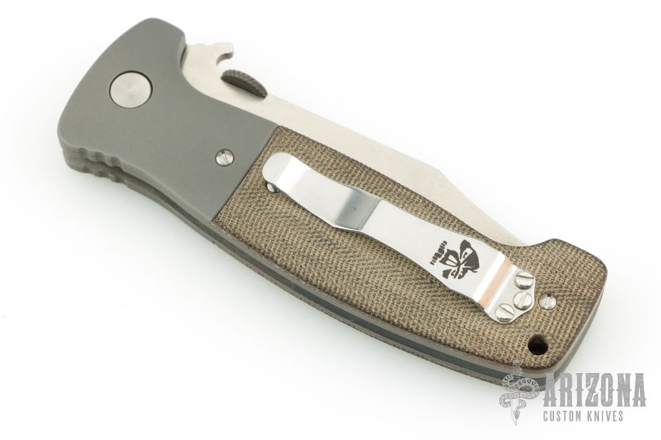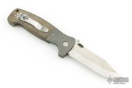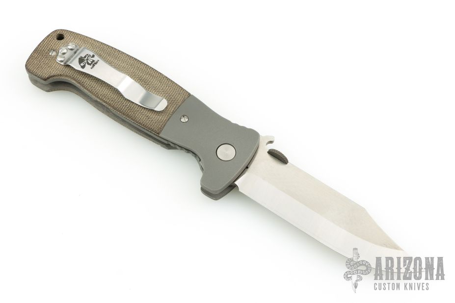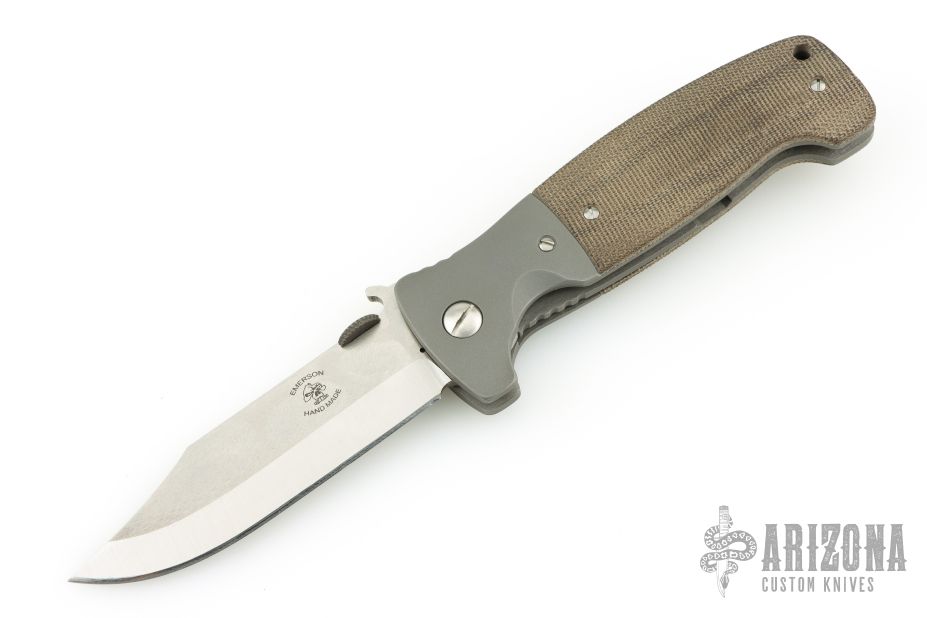 This is the CQC-12 Comrade, this design was based on Ernie's study of the AK-47 Bayonet. This is the same Model that Ernie himself carries. A true classic and a very rare opportunity for the serious Emerson collector. Satin finished clip point blade with thumbdisc and wave feature. The handle has bead blasted dovetailed titanium bolsters, green micarta scales, black G-10 backspacer, bead blasted titanium liners and a tip up stainless steel clip. Nice lockup, detent and blade seating. Comes with a zippered case. Has a scratch on the blade, has been lightly sharpened, otherwise excellent condition.