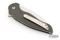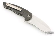 This Groundfighter by Greg Lightfoot features a satin finished recurve drop point blade with asymetrical swedge and flipper. The handle has an orange peel finished titanium frame with a lightning strike carbon fiber overlay on the lockside, tip up titanium clip. Rides on bearings, nice detent, lockup and blade seating. Comes with a zippered case. Has a couple light scratches, otherwise excellent condition.