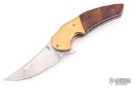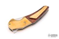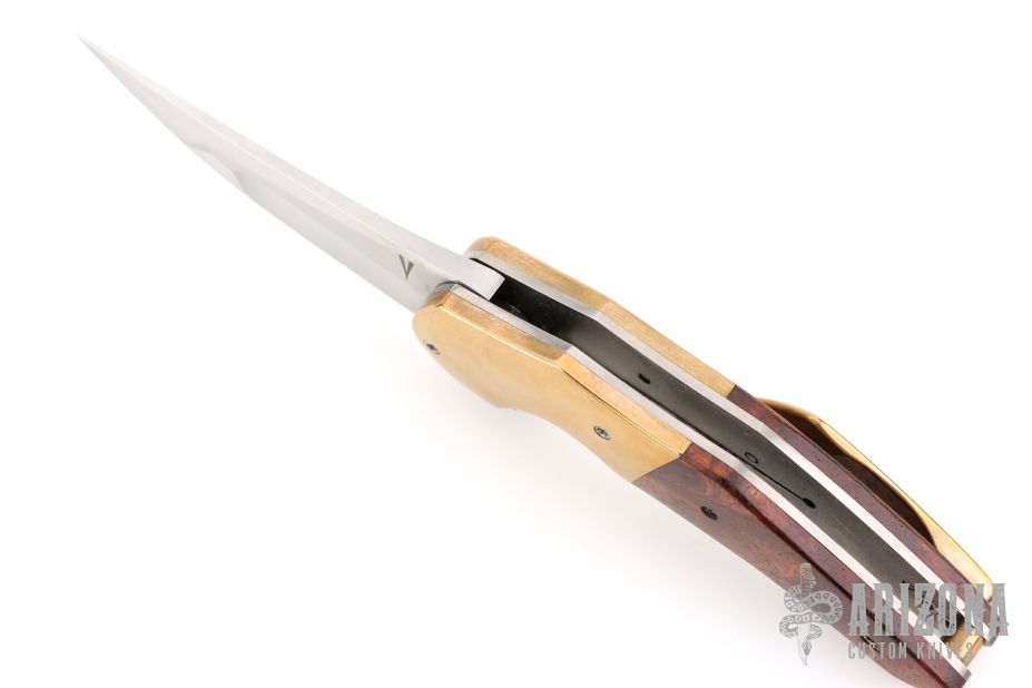 This Instigator from Jeff VanderMeulen features a 3" hand rub satin finished blade with flipper. The handle has a has brass bolsters/tip up clip, ironwood covers, and brass standoff. Comes in a zipper case. Has some scratches, and patina. Great overall condition.  Marked and Dated #2, 3-2017 inside the frame.