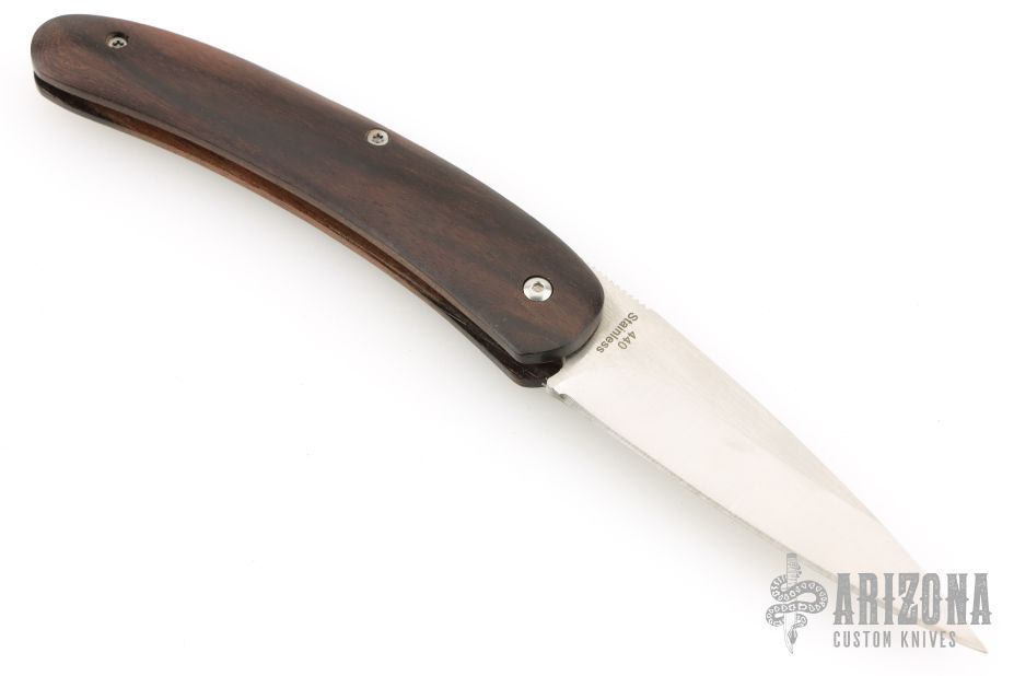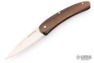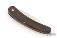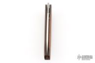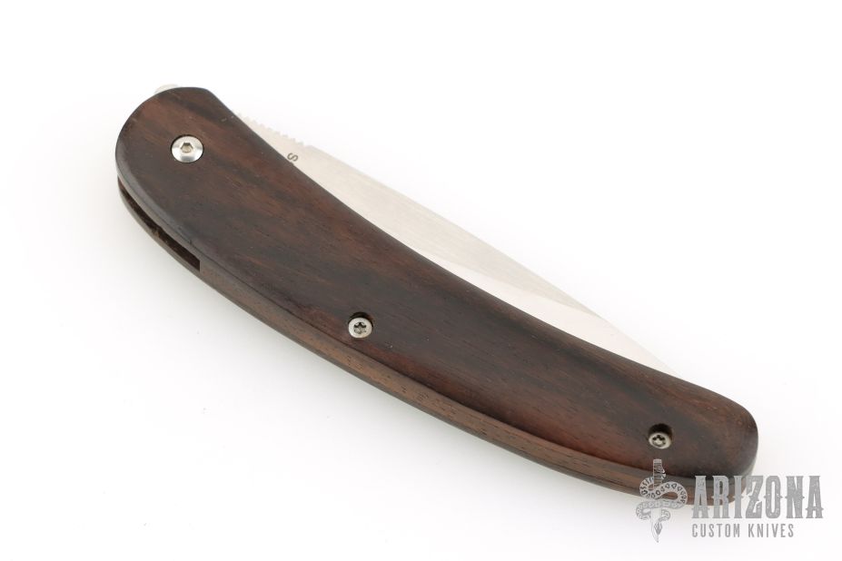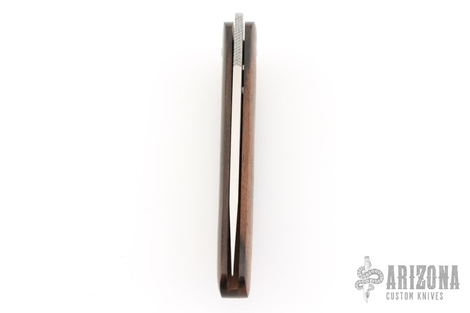 This Non-locking folder from Kelly Carlson features a satin finished wharncliffe style blade with checkered thumbrest, The handle has wood covers, and backstrap. Has a couple marks on the body, excellent condition otherwise.