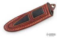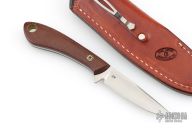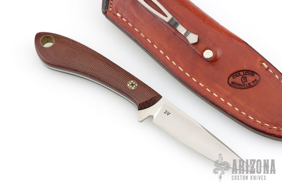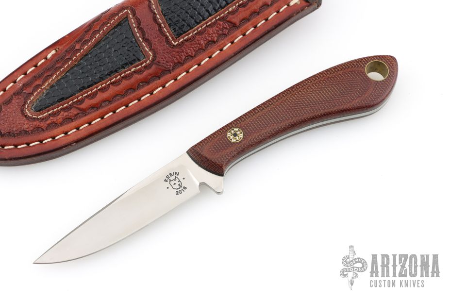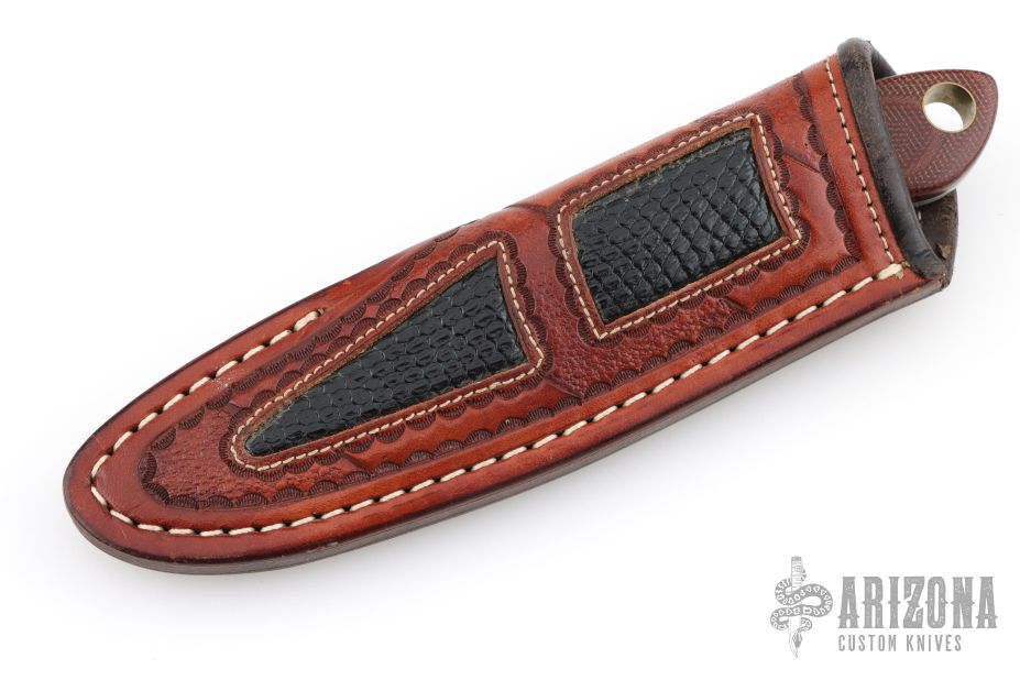 This TK-11 Wharnie by Tom Krein features a satin finished blade with .097" blade stock and .668" blade depth, full tang construction. The handle has brown canvas micarta scales with black liners and a mosaic pin and a lanyard tube. Includes a brown leather sheath with lizard inlays by Paul Long. Excellent condition. Dated 2016