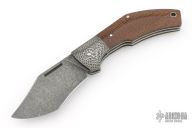 This Superbad Collab by Tashi Bharucha and Franck Souville features an acid wash and tumble finished blade with nail nick. The handle has Damascus dovetailed bolsters, burlap micarta scales, satin finished stainless steel liners and bead blast finished spring. Nice strong spring, nice blade seating. Comes with maker's embroidered knife wrap. Has a couple light scuffs, excellent condition otherwise.