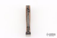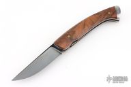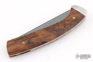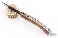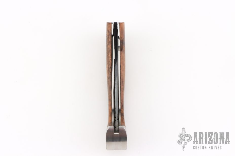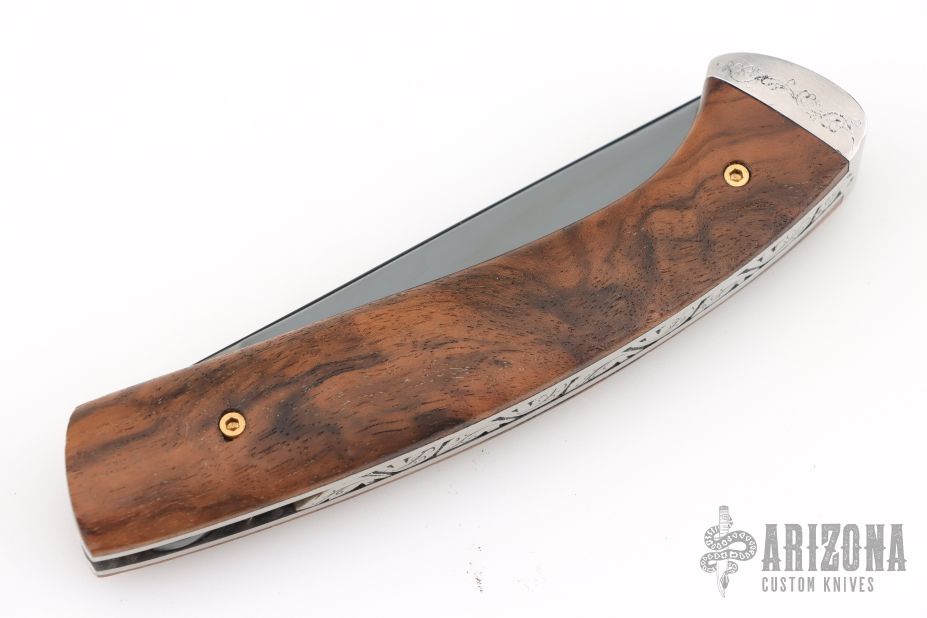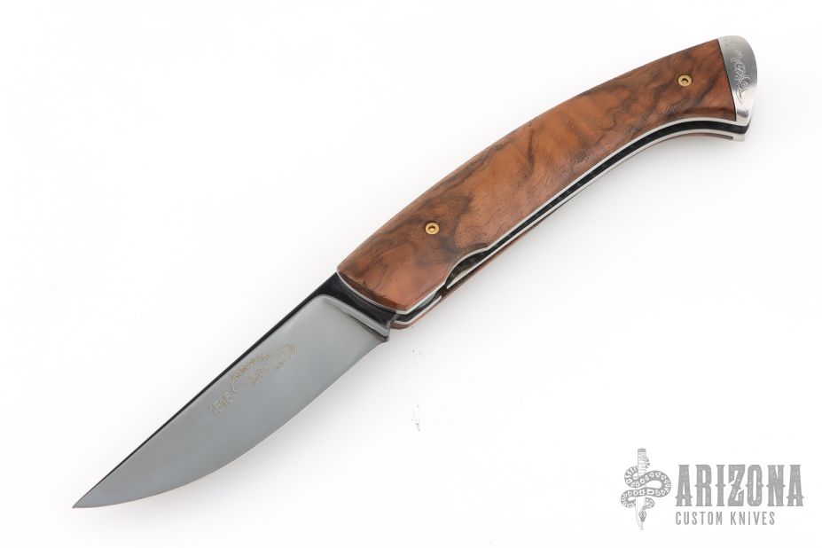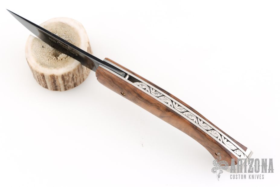 This 1515 by Theirs features a blued, mirror finished straight back blade. The handle is comprised wood scales with engraved stainless steel pommel over jeweled stainless steel liners, fileworked (inside and out) stainless steel backspacer. Nice detent, lockup and blade seating. Comes in a felt pouch. Has a couple light scuffs, excellent condition otherwise.