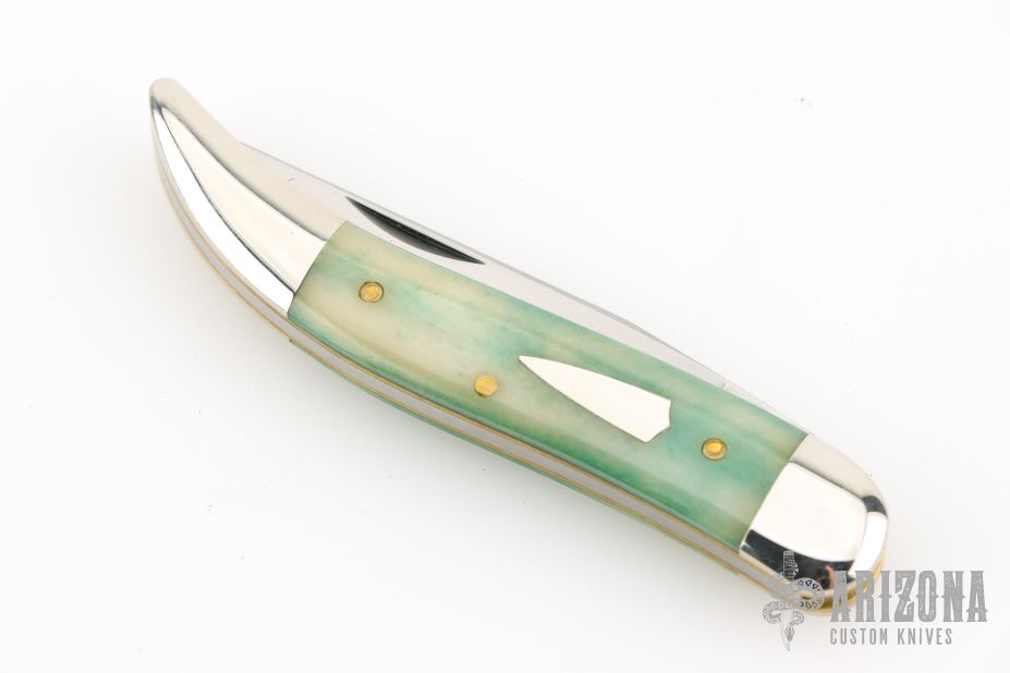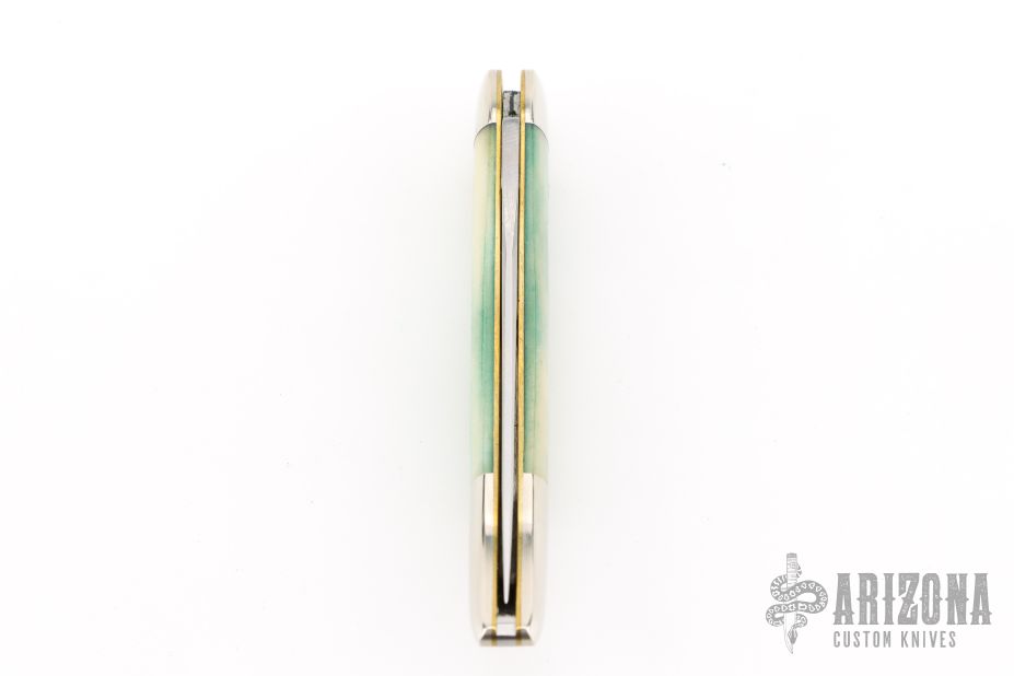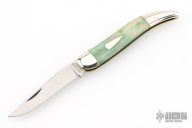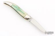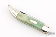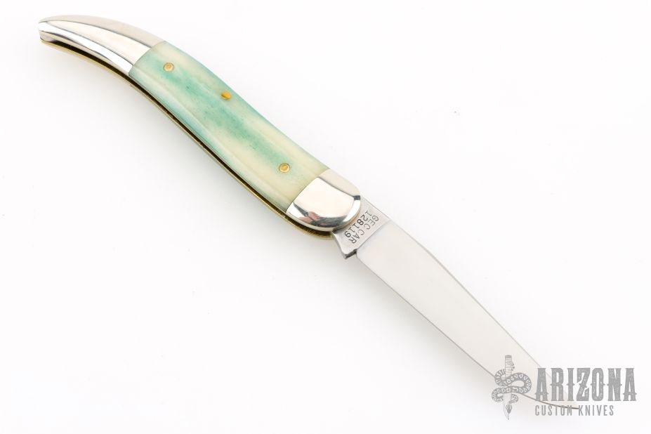This Toothpick by Great Eastern Cutlery features a satin finished blade with nail nick. The handle has nickel silver bolsters, aqua camel bone covers, brass liners, and a stainless spring. Comes with original tube and wax paper. Has some light scuffs and scratches, otherwise great condition.
