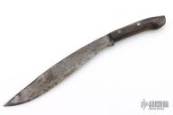 This JEST Bolo knife was made after the completion of the JEST School (Jungle Evasion Survival Training School) at NAS Cubi Point, Philippines. The participants of this training school are tracked and hunted in triple - canopy jungle and individually by the Negritos, if they are caught, they fail. This knife was hand forged by an instructor after completing the class. It is forged from a Jeep leaf spring and has caribou horn (Philippine Water Buffalo) handles, the handles are secured with steel rivets that are made with whatever can be found. It has .190" blade stock and 1.614" blade depth, full tang construction. This knife is very crude and rough, but is the preferred blade of the Philippines. It is used for everything from structure building, tool making, overall survival. This knife comes with a a wooden sheath. This one has some scratches and oxidation, has some dings on the blade edge, has some mushrooming on the spine from battening, has some chips in the scales, good condition for what it is.