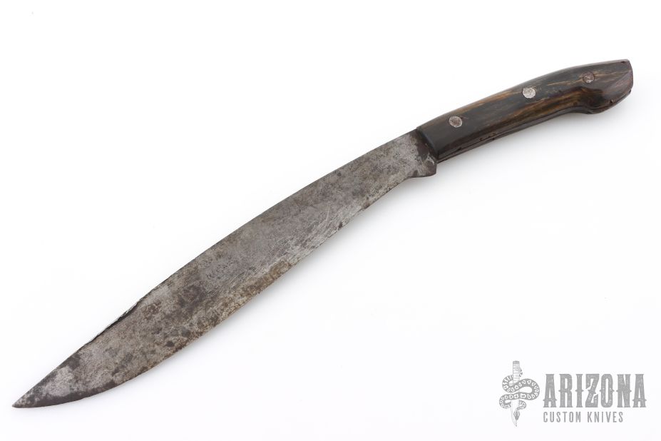 This JEST Bolo knife was made after the completion of the JEST School (Jungle Evasion Survival Training School) at NAS Cubi Point, Philippines. The participants of this training school are tracked and hunted in triple - canopy jungle and individually by the Negritos, if they are caught, they fail. This knife was hand forged by an instructor after completing the class. It is forged from a Jeep leaf spring and has caribou horn (Philippine Water Buffalo) handles, the handles are secured with steel rivets that are made with whatever can be found. It has .190" blade stock and 1.614" blade depth, full tang construction. This knife is very crude and rough, but is the preferred blade of the Philippines. It is used for everything from structure building, tool making, overall survival. This knife comes with a a wooden sheath. This one has some scratches and oxidation, has some dings on the blade edge, has some mushrooming on the spine from battening, has some chips in the scales, good condition for what it is.