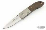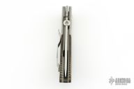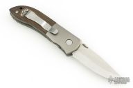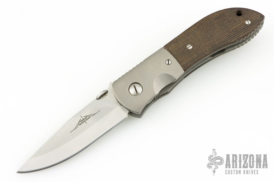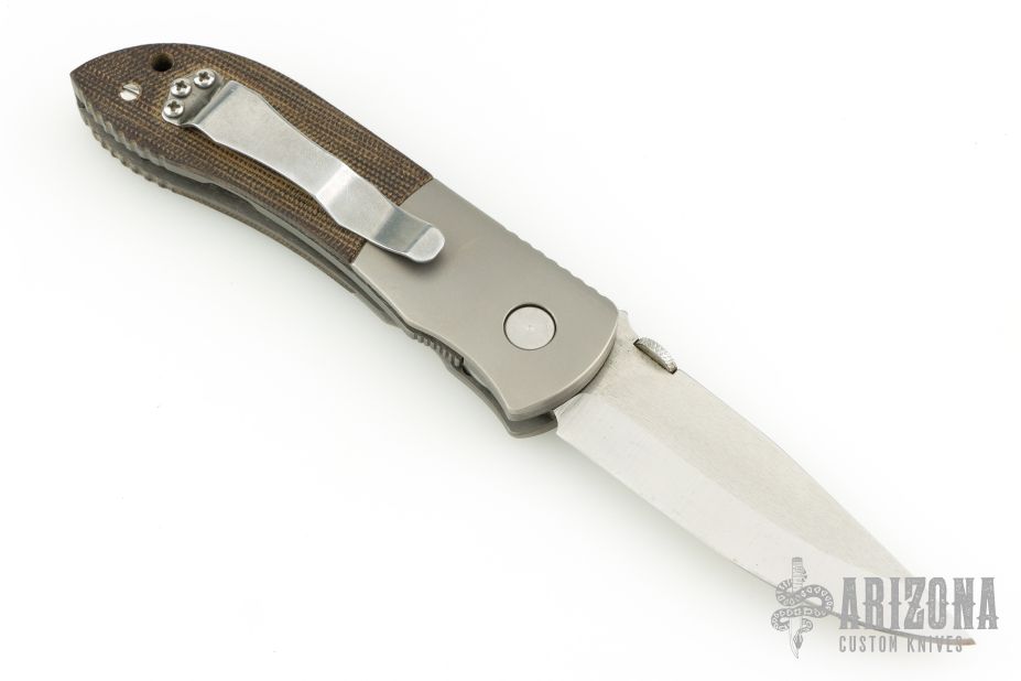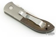 This Custom Emerson MV-4 Viper from Emerson Knives features a satin finished clip point blade with swedge, knurled thumb disc and notched thumb ramp. The handle is comprised of bead blasted and dovetailed titanium bolsters, green canvas micarta scales, bead blasted titanium liners and black G10 backspacer. The steel pocket clip is positioned for tip up carry. Lanyard hole in pommel. Nice detent, lockup and blade seating. Comes with a zippered case. Has some light scuffs, has been sharpened, otherwise excellent condition.