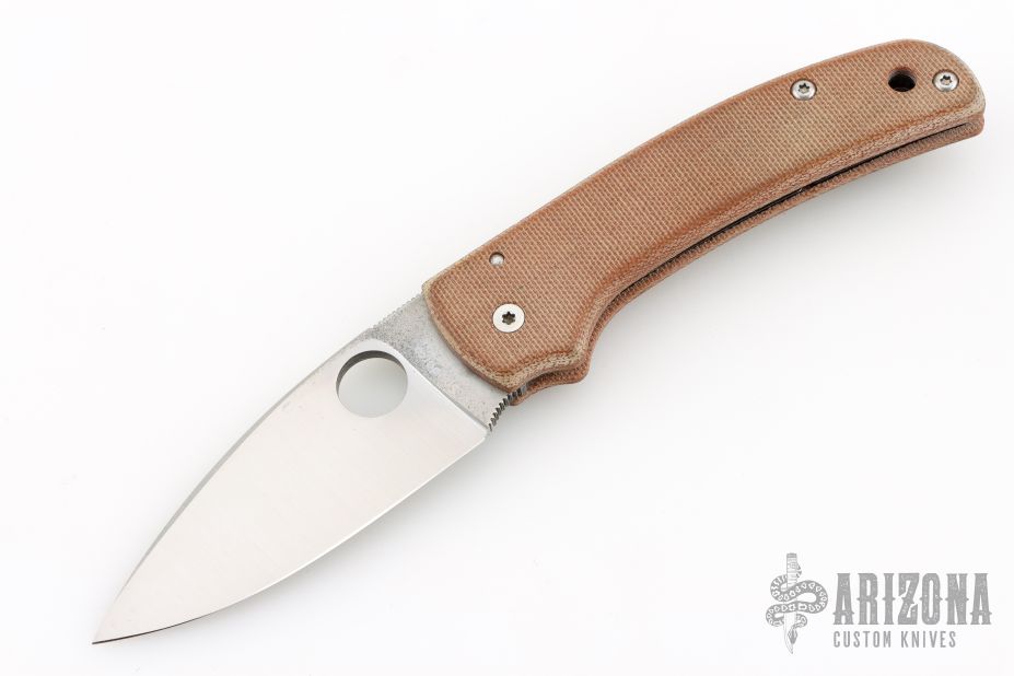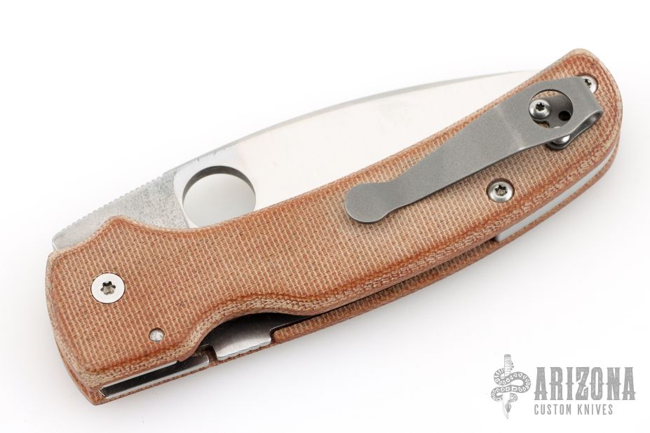 This Shaman PLN by Spyderco features a satin finished REX 45 blade with notched thumb and finger rests, thumbhole. The handle has custom natural canvas micarta scales, inlaid stainless steel liners and a stainless steel backspacer, tip up deep carry titanium clip, lanyard hole at the butt. The knife has a reground blade, you can still see the makers mark and blade steel on the ricasso. Excellent condition.