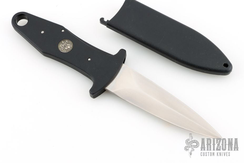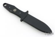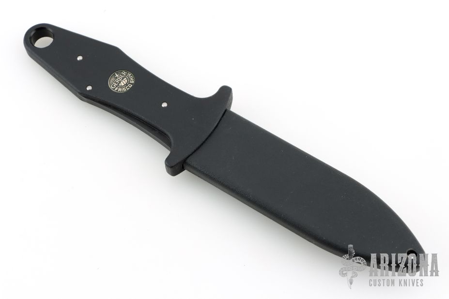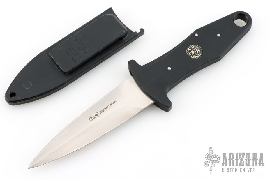 This knife is a Blackie Collins Design, features a satin finished double edged blade with .181" blade stock and 1.104" blade depth, hidden tang construction with black FRN handle. Comes with original sheath. Has some light scratches otherwise the knife is in good condition.
