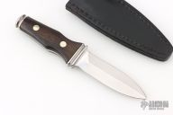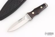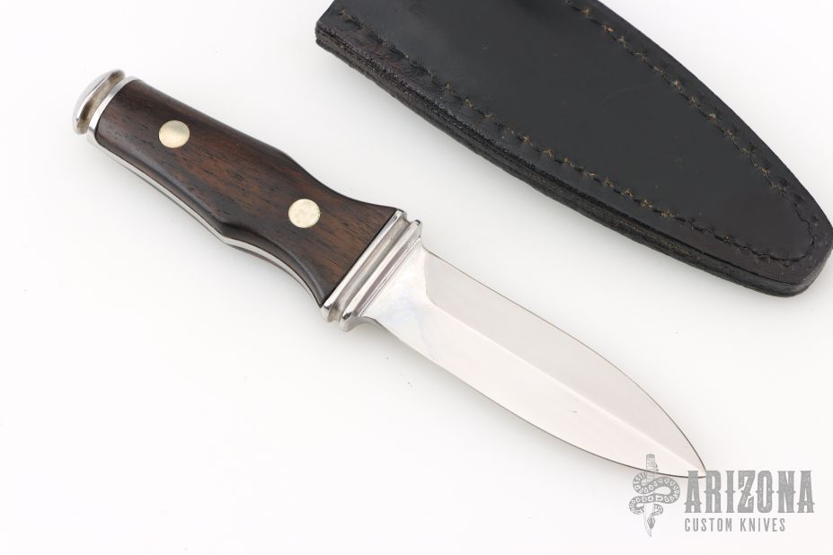 This is a very attractive boot knife from AG Russell. This is the older model made in Solingen, Germany. Blade is .141" thick and .893" deep at the ricasso and double-edged. Scales are wood. Integral construction with aluminum pins. Comes with a black leather sheath. Has some light scratches otherwise the knife is in excellent condition.