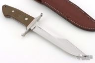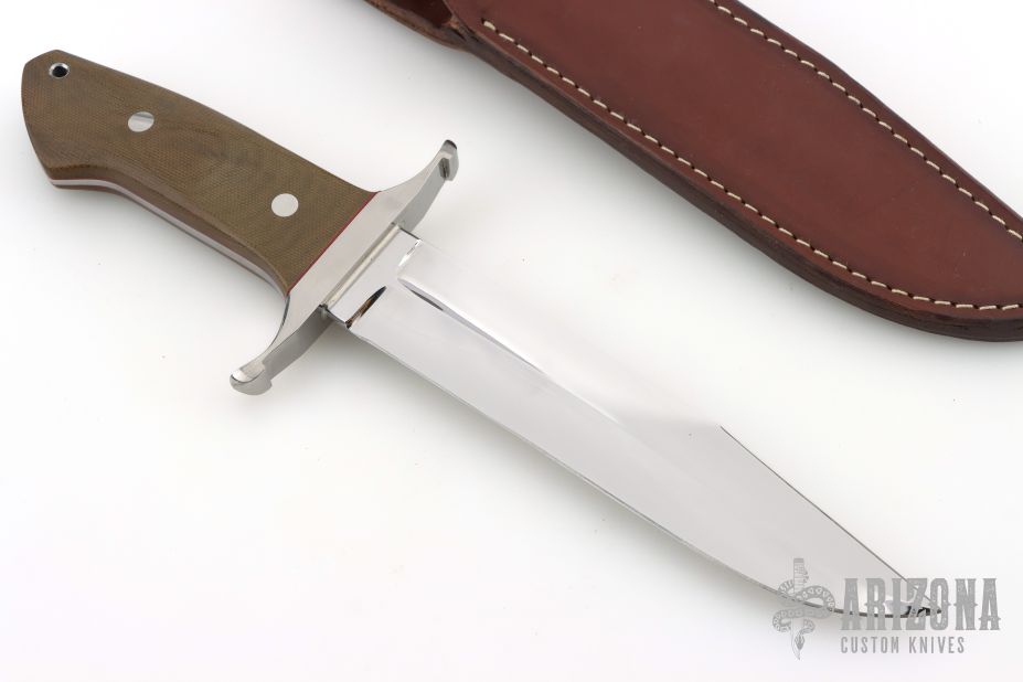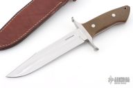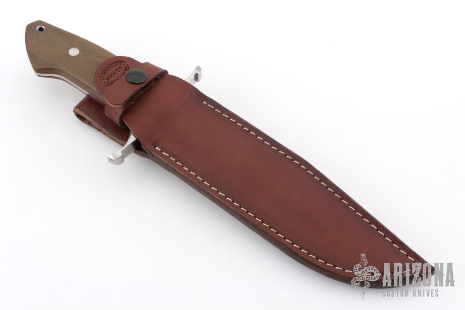 This Loveless Style Battle Knife by Tim Steingass features a mirror finished blade with a sharpened top edge, .244" blade stock and 1.435" blade depth, full tapered tang construction.  The handle features a stainless steel guard, green canvas micarta scales with red liners, stainless steel pins and lanyard hole. Includes a brown leather sheath. New from maker!