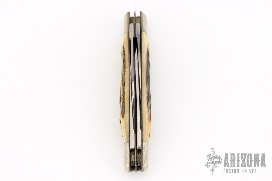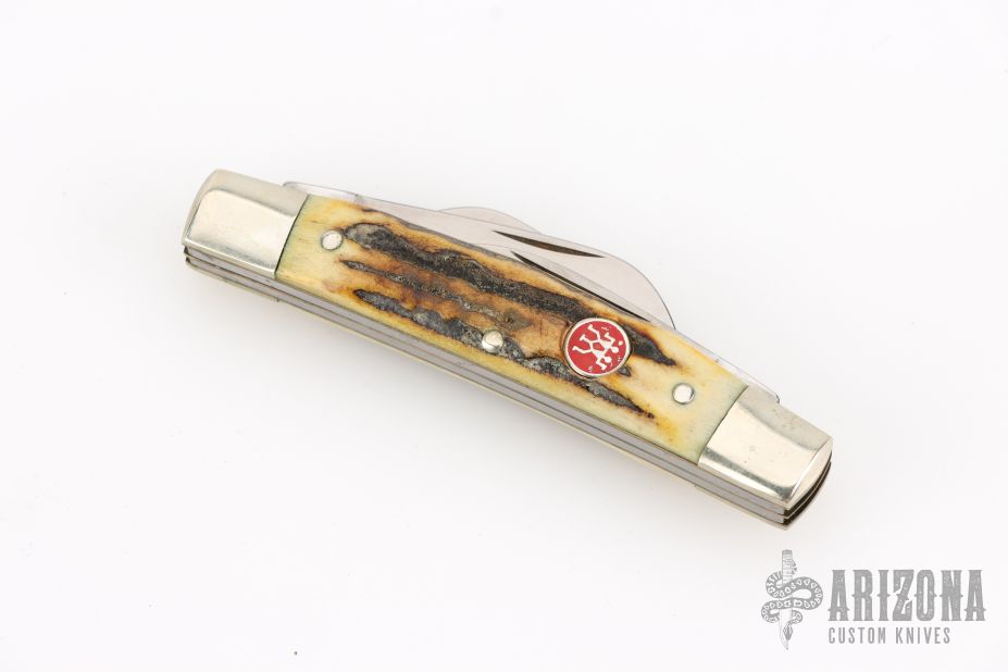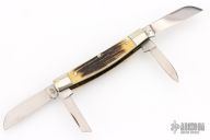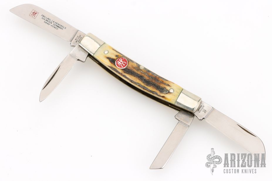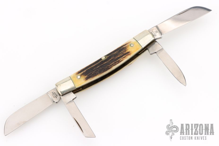 This 4-Blade Congress by JA Henckels features 4 mirror polished blades with nail nicks. The handle has nickel silver bolsters, stag covers with escutcheon, brass liners, stainless steel springs. Has half-stops, flush in all positions. Has some light scratches and a little patina, otherwise excellent condition.