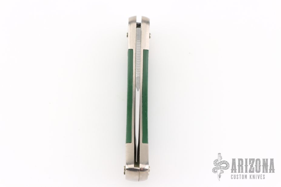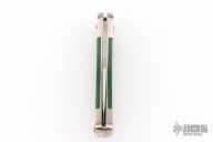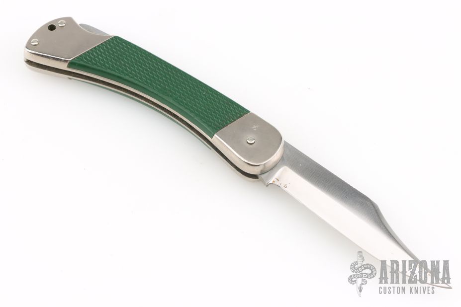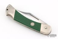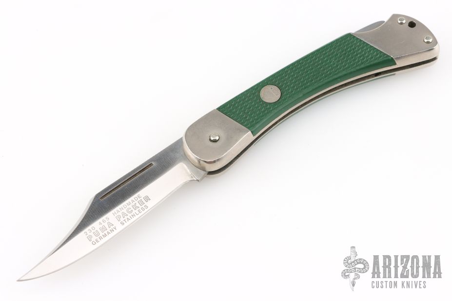 This 465 Puma Packer by Puma Knives, features a satin polish finish clip point blade with nail nick. The handle has nickel plated frame with green insets. Comes with original box and papers. Has some scuffs and scratches, great condition otherwise.