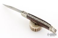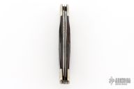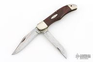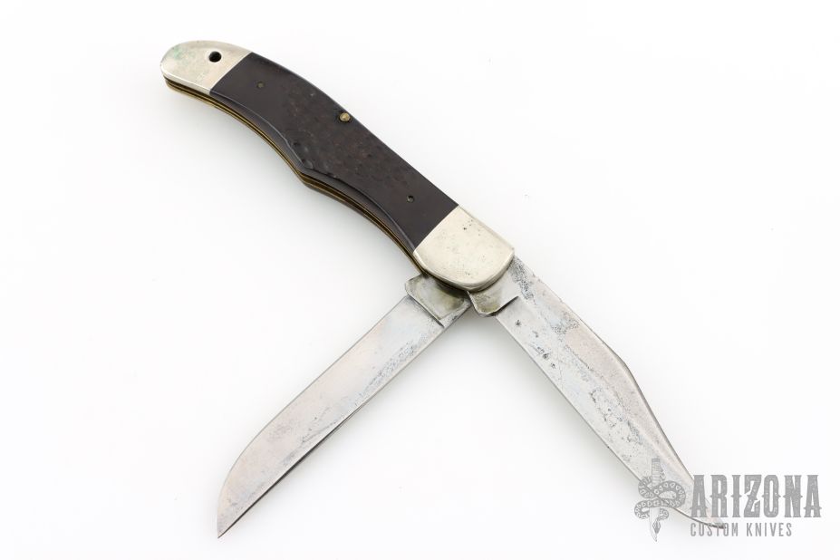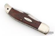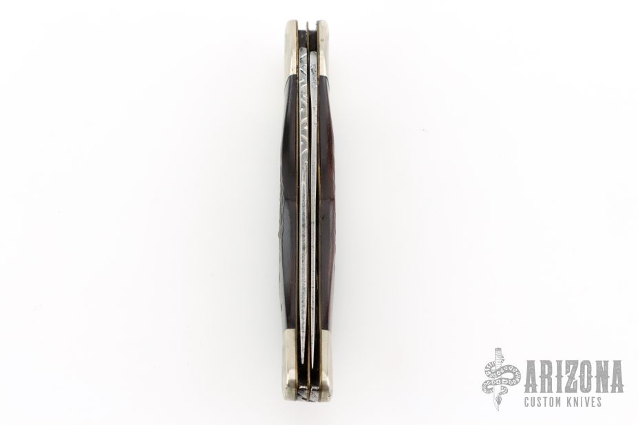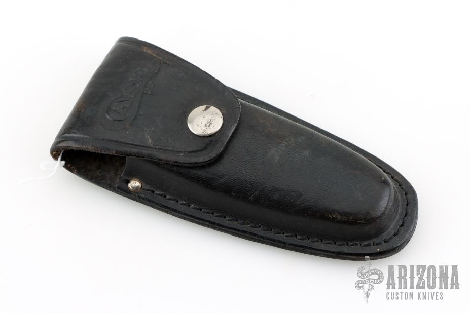 This vintage two blade slipjoint by Case with jigged wood covers and nickel silver bolsters, brass liners, stainless steel springs. Has satin finished blades with nail nicks. Comes with original black leather sheath. 1980. The blade spine and springs have been file-worked. Has some light scratches and some small oxidation spots, good condition otherwise.