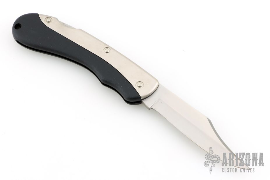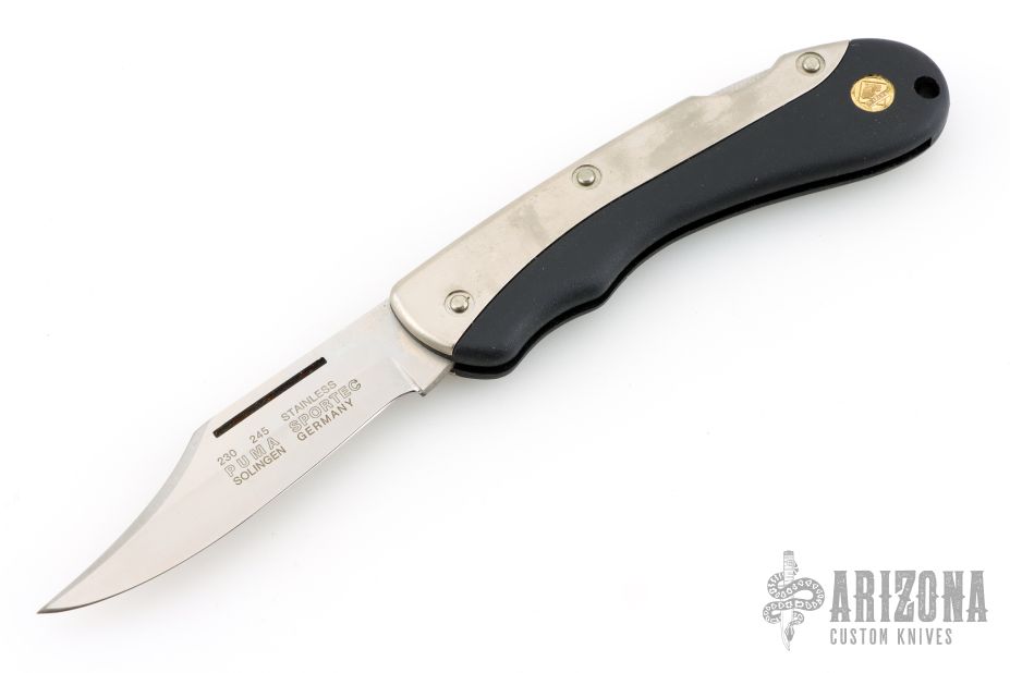 This Puma Sportec features a satin finished clip point blade with long pull nail nick. The handle has aluminum and Delrin constriction with steel rockerbar. Lanyard hole in pommel with 23981 on the lock. Comes in a puma 16/246 box. Has some scuffs and scratches, good condition otherwise.