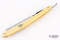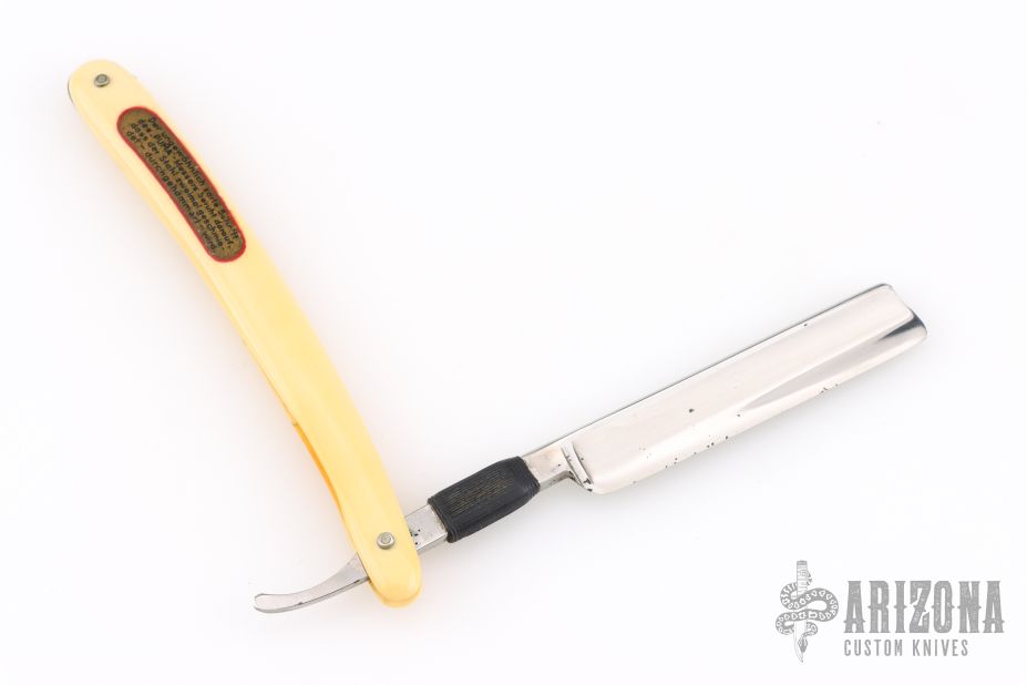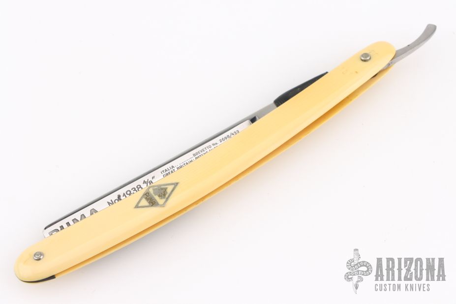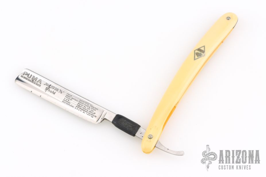 This Straight Razor by Puma features a full hollow ground, satin finished blade with a yellow handle. Has scuffs, scratches, and patina. Good overall condition.