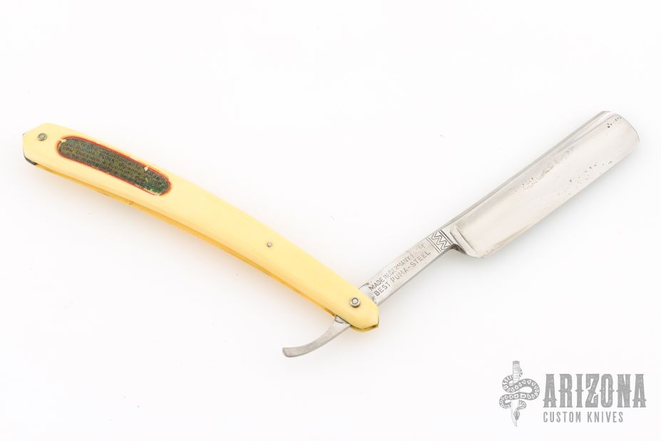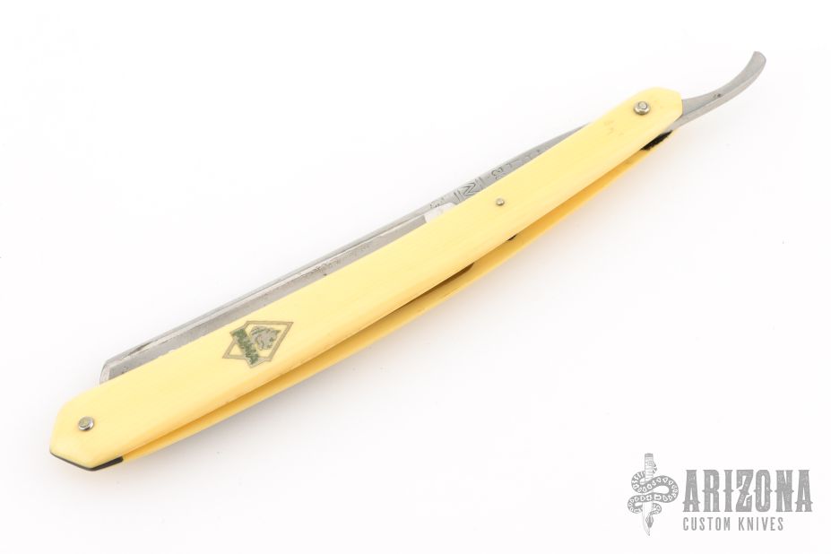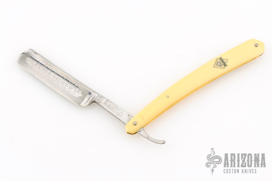 This Straight Razor by Puma features a full hollow ground, polish finished blade with a yellow handle. Has scuffs, scratches, and patina. Good overall condition.
