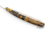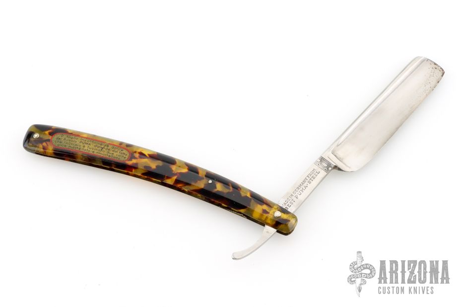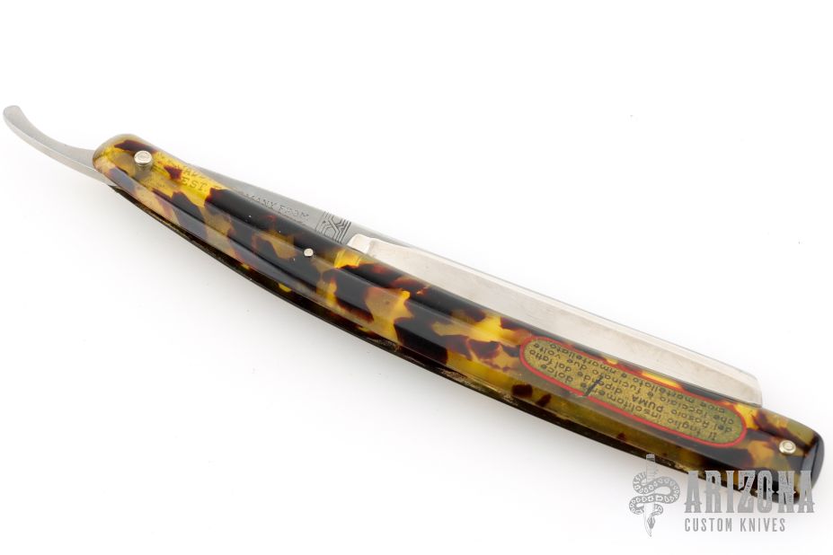 This Straight Razor by Puma features a full hollow ground, satin finished blade with a yellow/brown handle. Has scuffs, scratches, and some oxidation. Good overall condition.