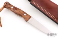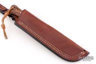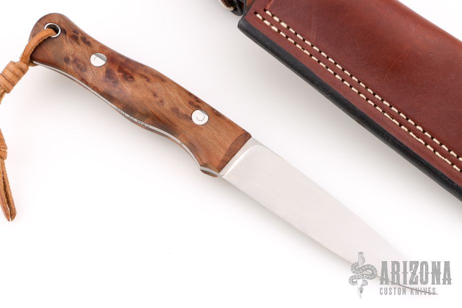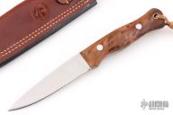 This Mountaineer from Adventure Sworn features a satin finished blade with .128” blade stock and 1.045” blade depth, full tapered tang construction. The handle has redwood burl scales with stainless steel bolts and lanyard hole. Comes with a brown leather sheath. Excellent condition.