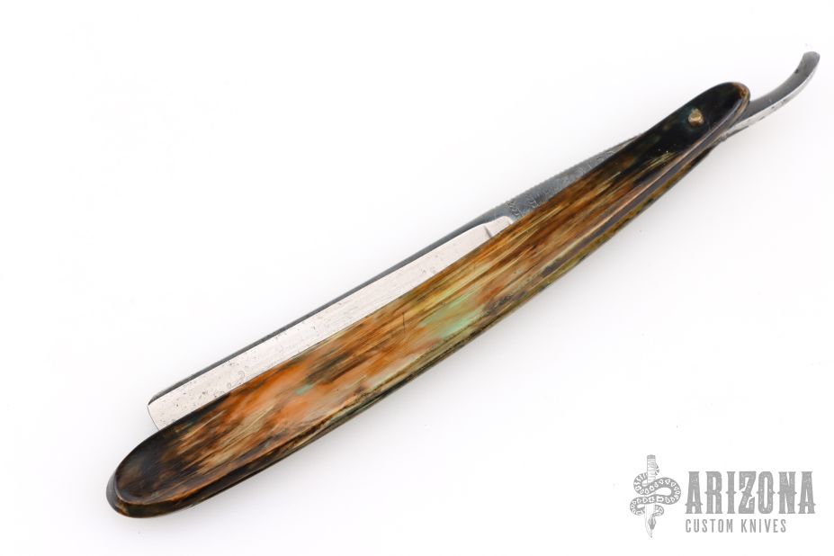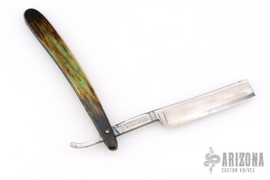 This Straight Razor by Puma features a full hollow ground, satin finished blade with a black/brown/blue/pink handle. Has scuffs, scratches, and patina. Good overall condition.