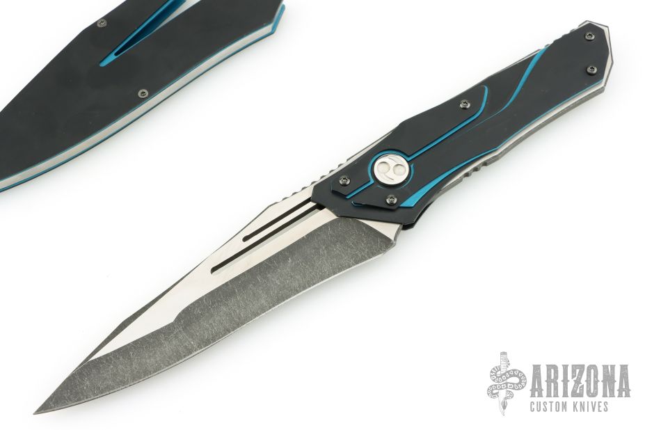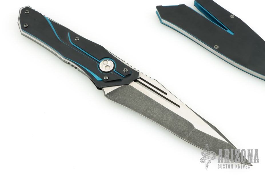 This Homura by Dew Hara features a two-tone multiground blade with false top edge and notched thumbrest, .152" blade stock and 1.420" blade depth, full tang construction. The handle has three layers of anodized aluminum. Comes with an anodized aluminum and stainless steel scabbard. Has a few light scuffs, otherwise excellent condition. Comes with a zippered case.