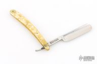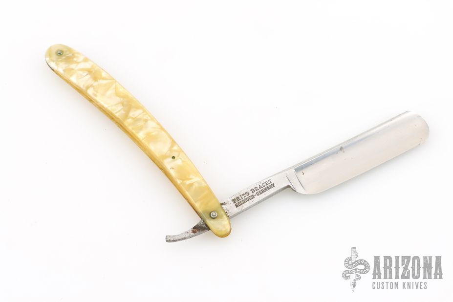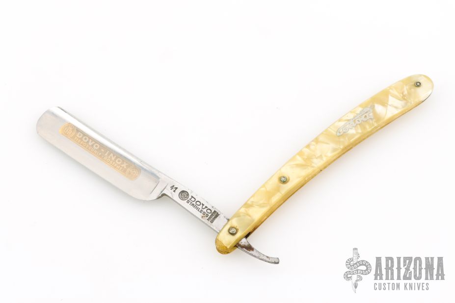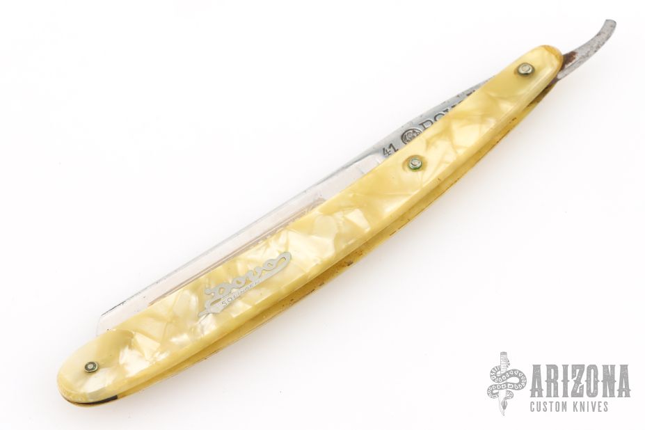 This Straight Razor by Dovo Knives features a traditional style straight razor blade with gold etch. The handle is yellow. Has some scuffs, scratches, and patina. Good overall condition otherwise.