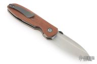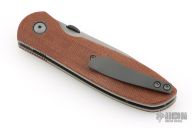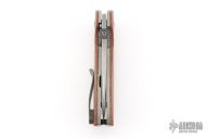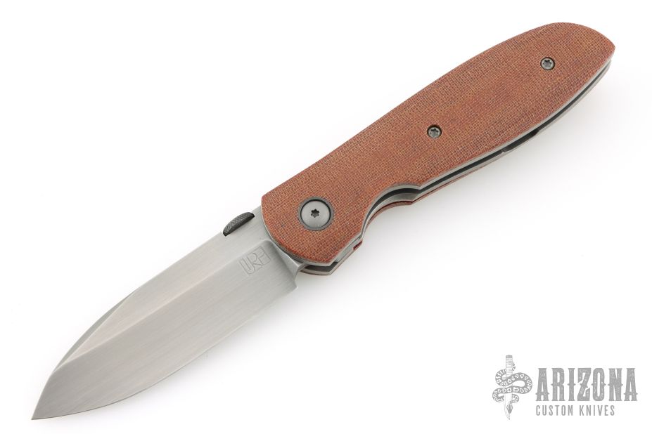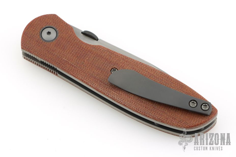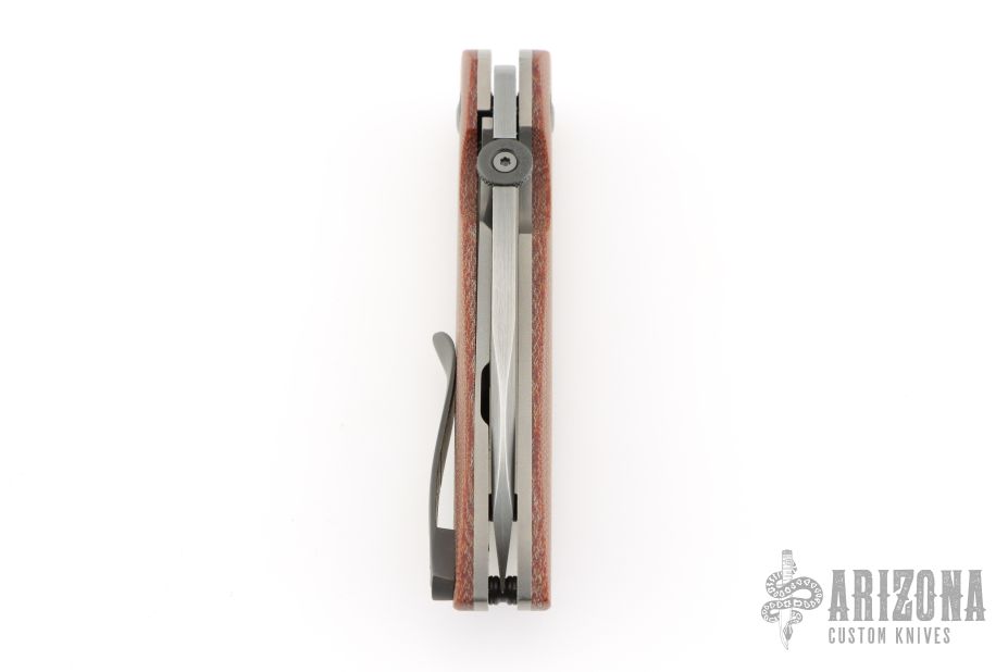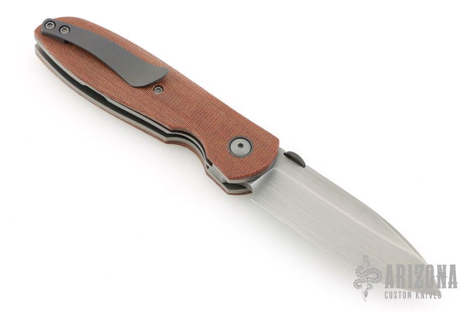This Prototype Large Griffon by Jared Price features a dark hand rub satin finished blade with thumbdisc. The handle has Vintage Mocha linen micarta scales, darkened titanium pivot collars and tip up clip, blasted hardware and titanium liners, black standoffs. Rides on ceramic bearings, nice ceramic detent, lockup and blade seating. Comes with original box. New from maker!