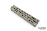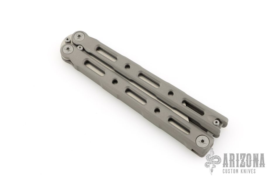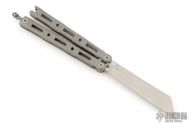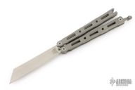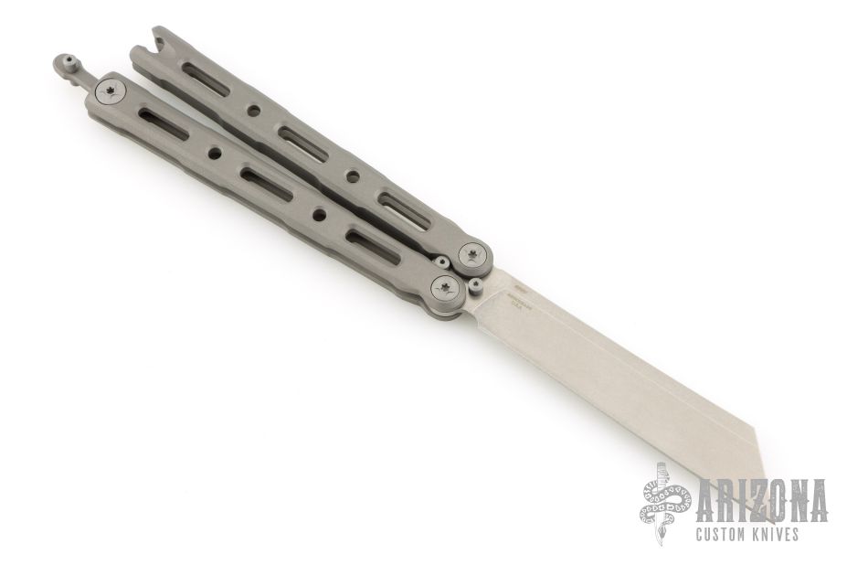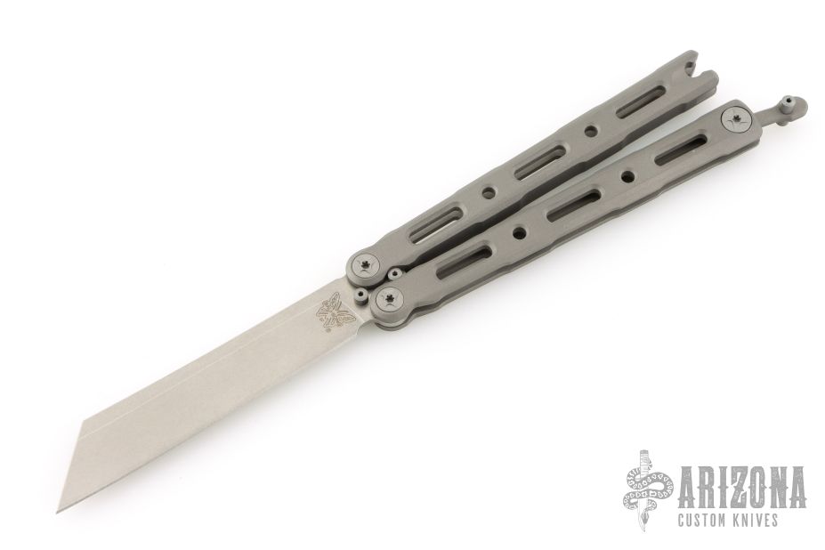This Model 87 Balisong by Benchmade features a tumble finished wharncliffe style blade. The handle has an integrally constructed, skeletonized titanium frame with bead blast finish. Spring-loaded T latch on pommel. Comes with original box, pouch, and papers. Excellent condition.