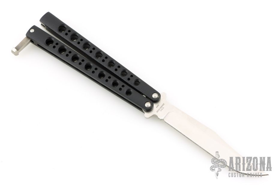 This Model-43 by Benchmade features a tumble finished clip point blade with false top edge. The handles are channel construction with a black finish, and a T-latch. Comes with original box, papers and nylon belt sheath. Excellent condition.