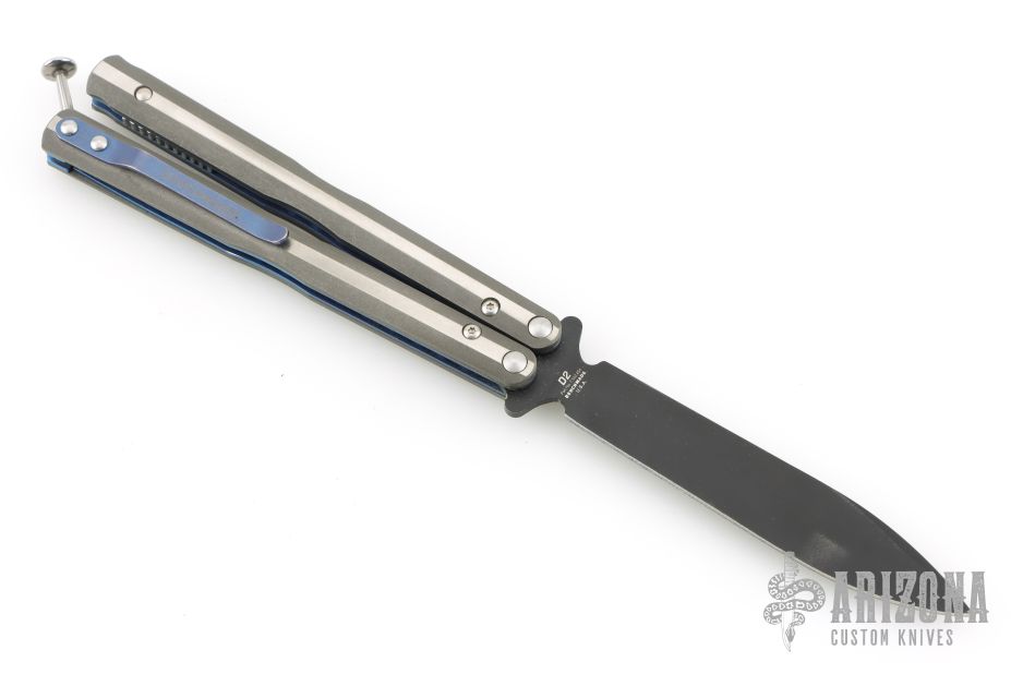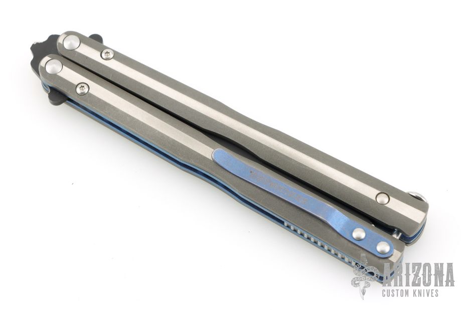 This Benchmade balisong has a black drop point blade with swedge. The handle has two tone titanium covers with no holes, anodized liners and latch. Comes with original box, papers, and draw string pouch. The knife has some scuffs and scratches, great overall condition otherwise.