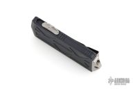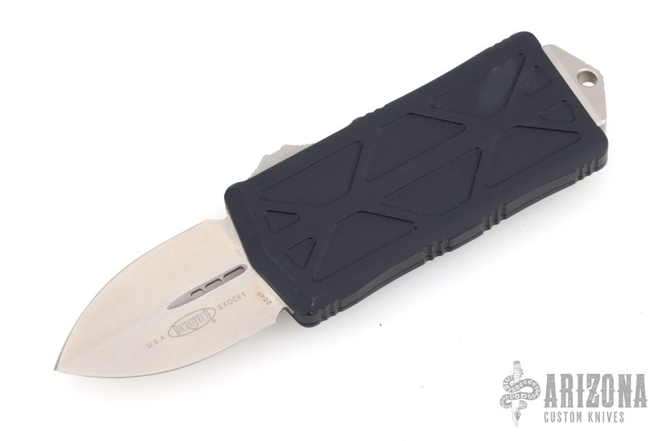 This Microtech Exocet features a 204p stonewash finish spear point blade. The handle has a black aluminum handles and a stainless clip that doubles as a money clip dated 08/2019 s/n 550. Comes with original box and papers. Has a couple light scuffs, excellent condition otherwise.