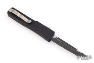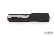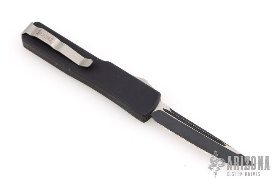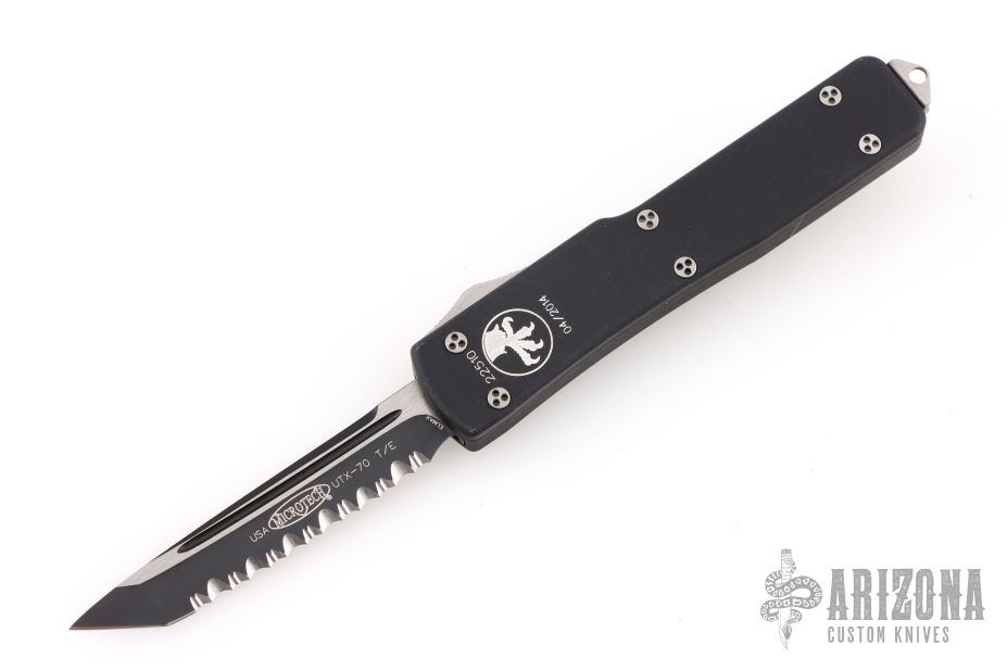 This UTX-70 OTF automatic features a black serrated tanto blade. The handle has a black aluminum frame with black stainless steel hardware and clip. Serial number 22510 dated 04/2014. Comes with original box, pouch, and papers.  Excellent Condition.