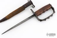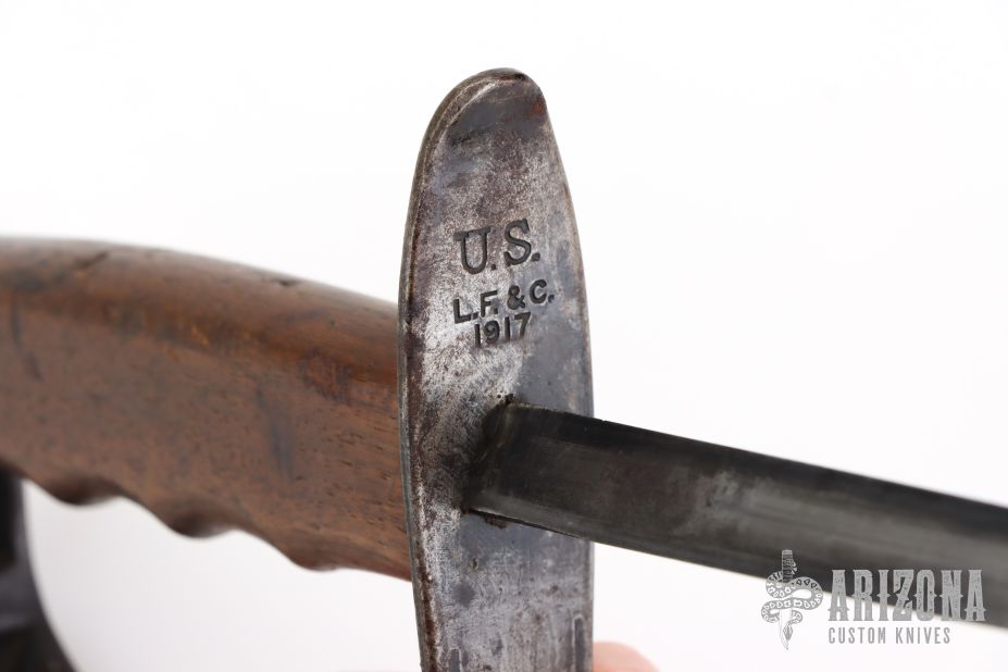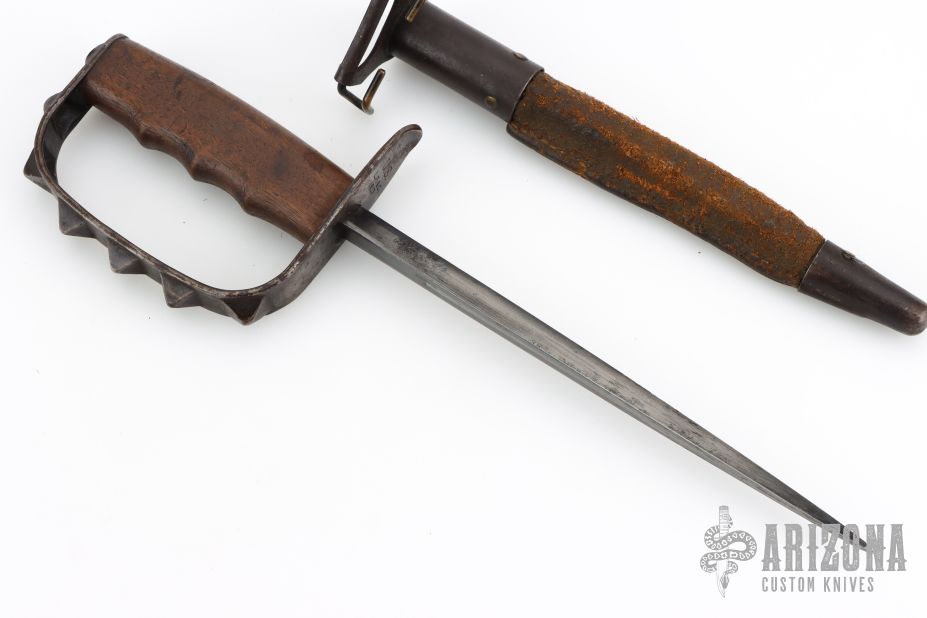 This is a 1917 L.F.&C. Knuckle Trench Knife. It has a black finished triangle dagger blade that is .569" thick at the base. The handle has a spiked/knob D-guard and a wood handle. Comes with original scabbard that is in good condition. Good condition for it age. Rare! Has some light scratches and patina, otherwise good condition for its age.