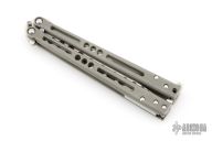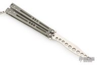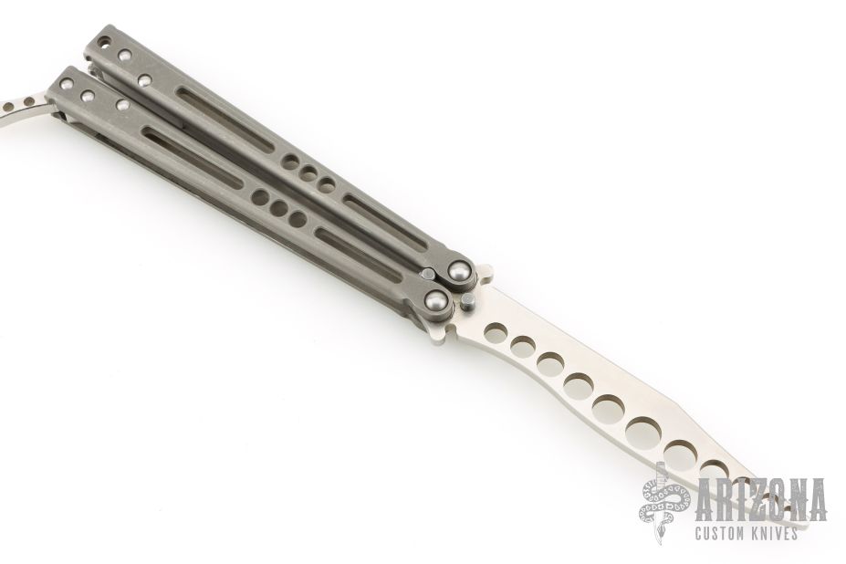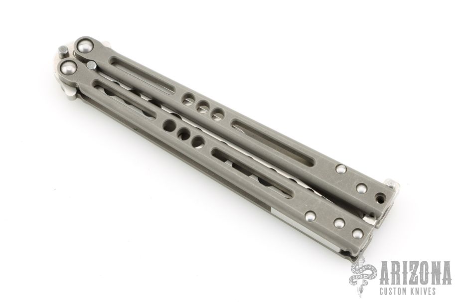 This Prodigy Trainer Balisong from Jerry Hom features a satin finished recurve blade with hole pattern. The handle is comprised of bead blasted titanium handles with satin titanium backspacers. Includes original box and papers. Has scuffs and scratches, great overall condition.