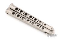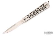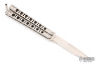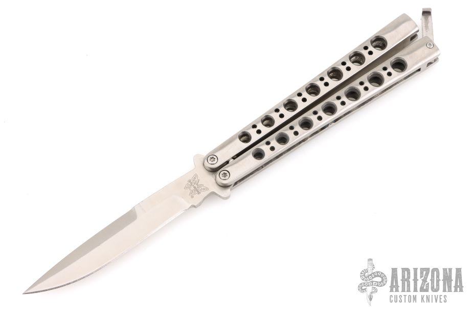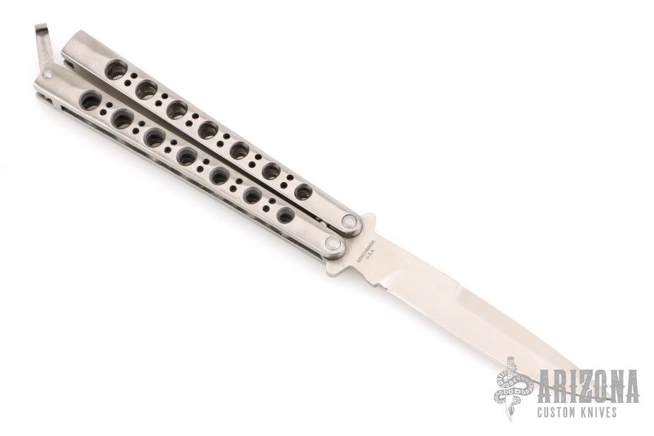 This Model 42 Balisong by Benchmade features a satin finished blade with swedge. The handle has an integral skeletonized titanium handles with t-latch on pommel. Comes in a BM nylon belt sheath. Has a few light scuffs and scratches, excellent condition otherwise.