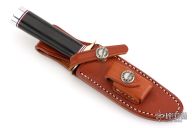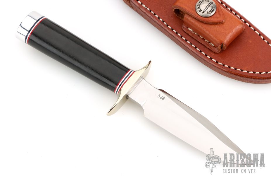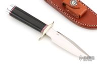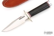 This is a miniature Model 1 - with all the features of the famous WWII full size Model 1. Stainless steel blade with top edge sharpened approximately 1 3/4 inches back from the tip, .172" blade stock and .841" blade depth, hidden tang construction. The handle has a nickel silver double guard, duralumin butt, and a black linen micarta grip with red/white/blue spacers. Comes with a brown leather sheath and a zippered case. In addition, the knife is authenticated by a coded transponder which cannot be altered. The transponder is inserted into the handle during construction with an encoded serial number matching the etched number on the blade. Only 1500 made. Serial number 588. Excellent condition.