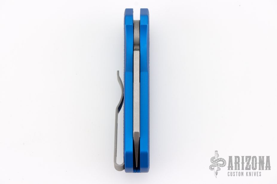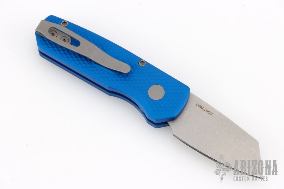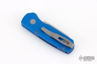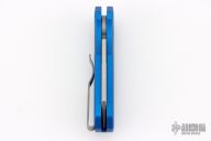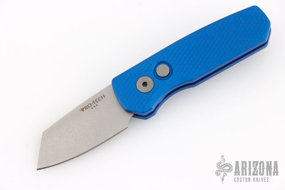 The Runt 5 by Pro-Tech Knives features a tumbled sheepsfoot style blade.  The handle features a blue milled aluminum handle with a bead blast finished tip up stainless steel pocket clip. Comes with original box, pouch and papers. Excellent condition.