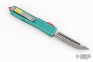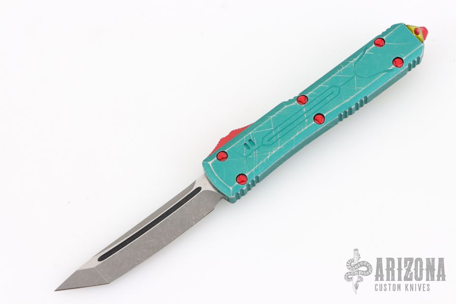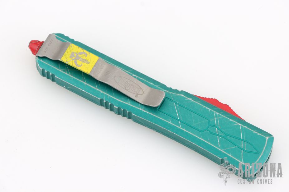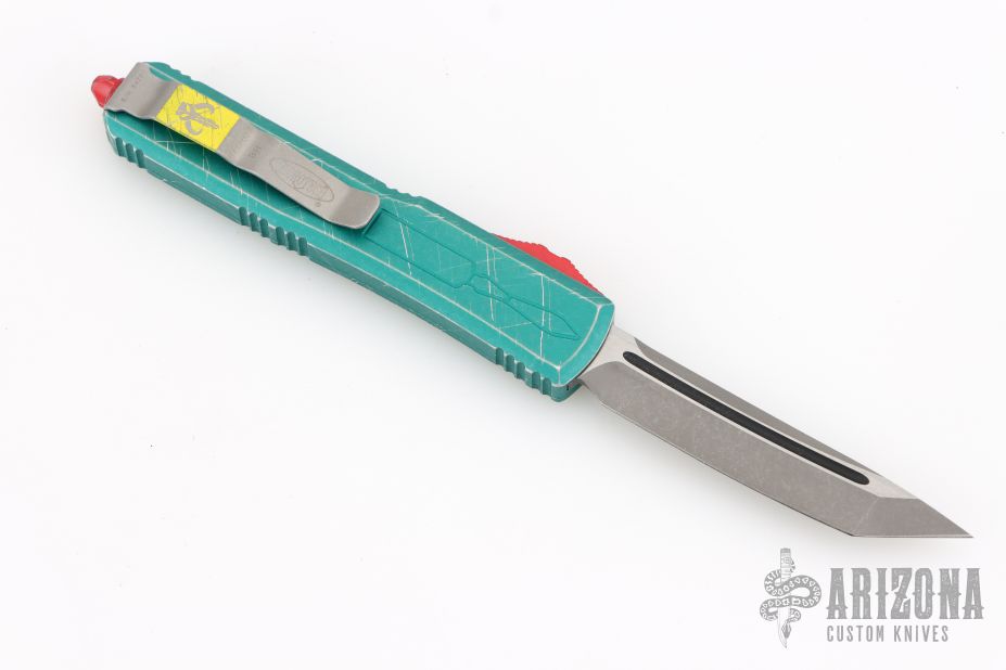 This Star Wars themed Ultratech by Microtech knives features a standard tanto blade with fullers and apocalyptic finish. The handle has a green battle worn aluminum frame with red and yellow hardware. Comes with original box and papers. Dated 04/2022 #5477. Excellent condition.
