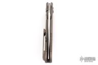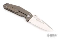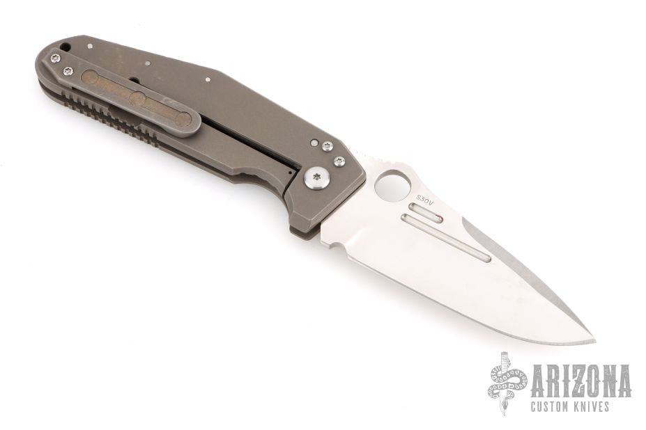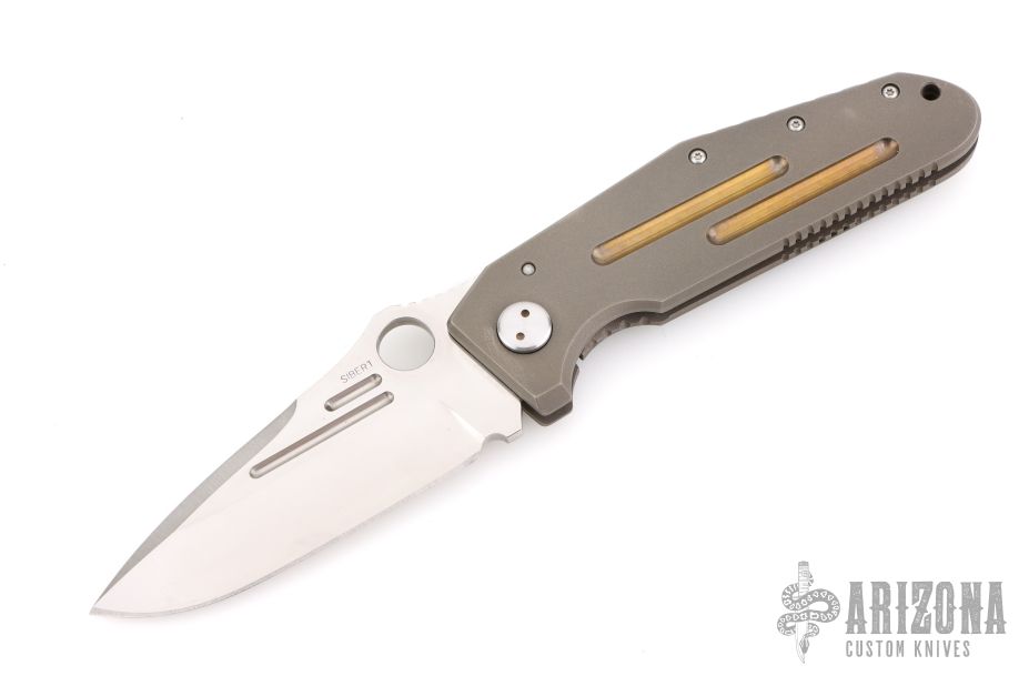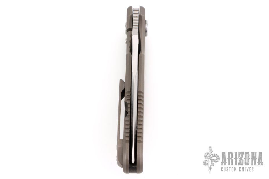 This Pocket Rocket by Shane Sibert features a satin finish blade with notched thumbrest and thumb hole. The handle has a bead blast and selectively anodized finished titanium frame, with micarta backstrap and lanyard hole in pommel. Pins are inlaid in the back spacer. Tip up or down titanium clip. Nice detent, lockup and blade seating. Comes in a zipper case. Has some scuffs/scratches, otherwise good condition.