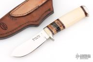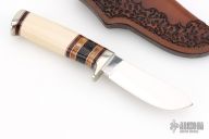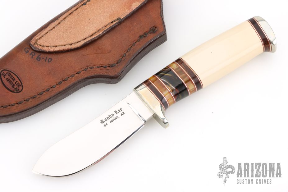 This Semi-Skinner by Randy Lee features a mirror polished blade with .200" blade stock and 1.042" blade depth, hidden tang construction. The handle has a nickel silver guard and butt, ivory paper micarta grip, and a spacer pattern consisting of red/nickel silver/ironwood/amber/acrylic. Comes with a hand tooled brown leather sheath. Excellent condition.