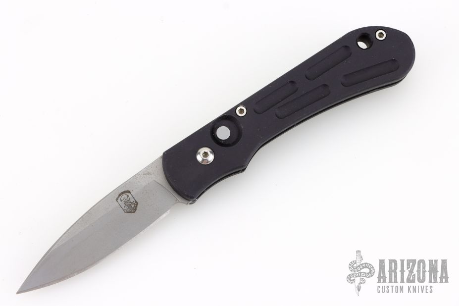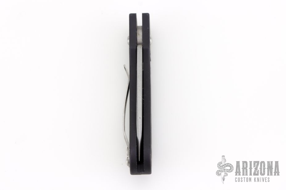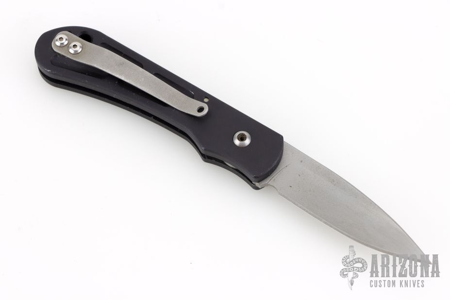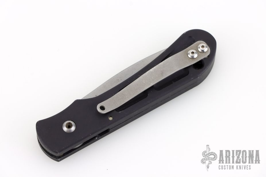 This Guardian Angel II by Rob Dalton features a bead blast finished drop point blade. The handle has a black aluminum frame with tip up bead blasted stainless steel clip. Nice lockup and blade seating. Has some light scuffs and patina, otherwise good condition.