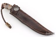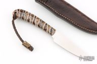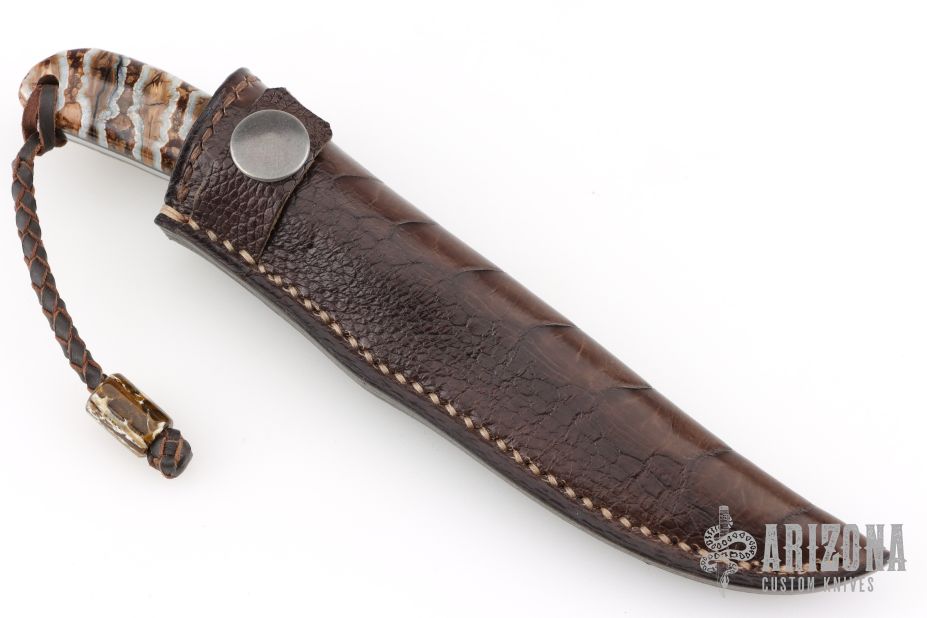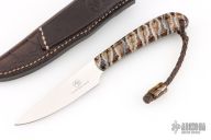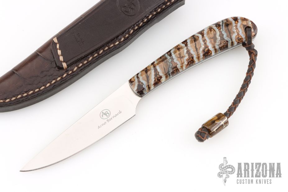This "Fin and Feather" by Arno Bernard has mammoth molar handle scales. Stone wash mirror finish N690 blade with .100" blade stock and .78" blade depth, full tang construction. Includes a brown leather sheath. Has a couple light scratches, otherwise excellent condition.